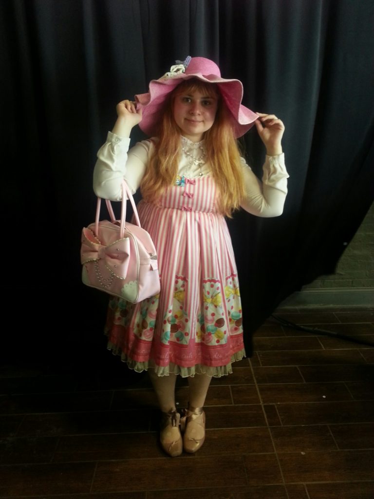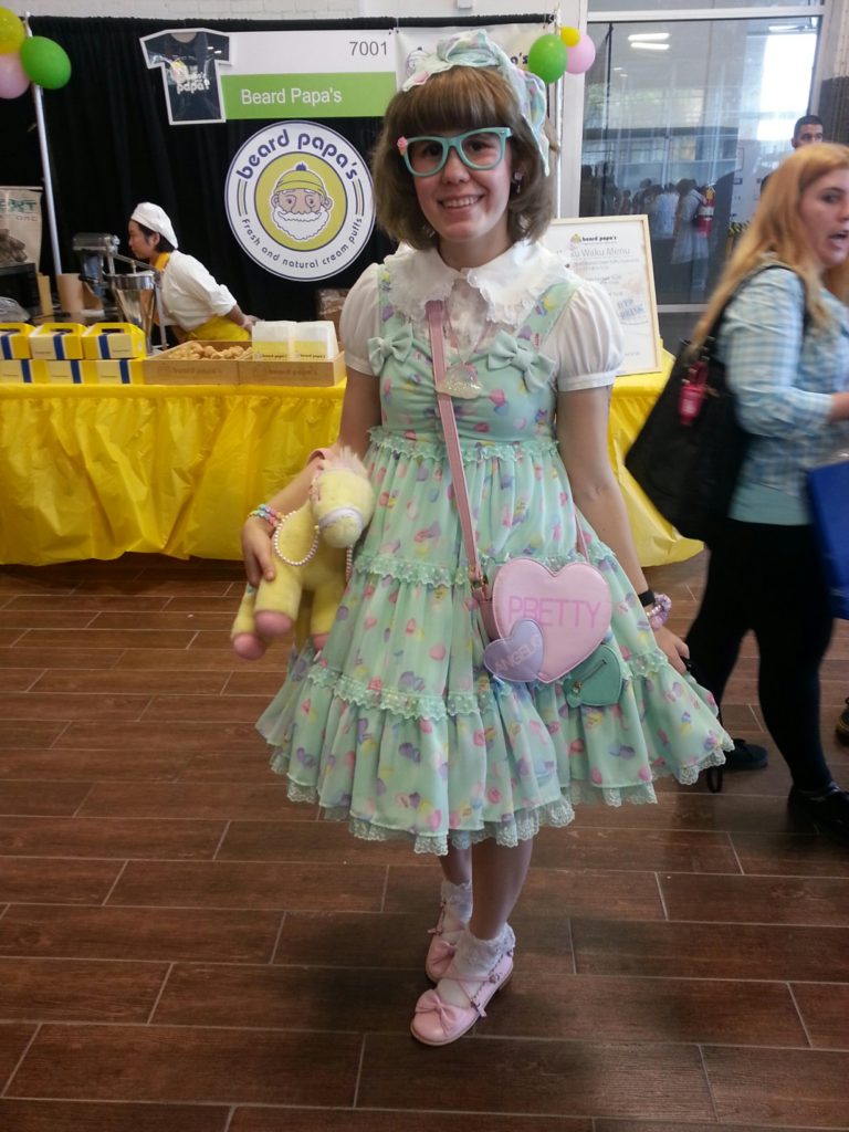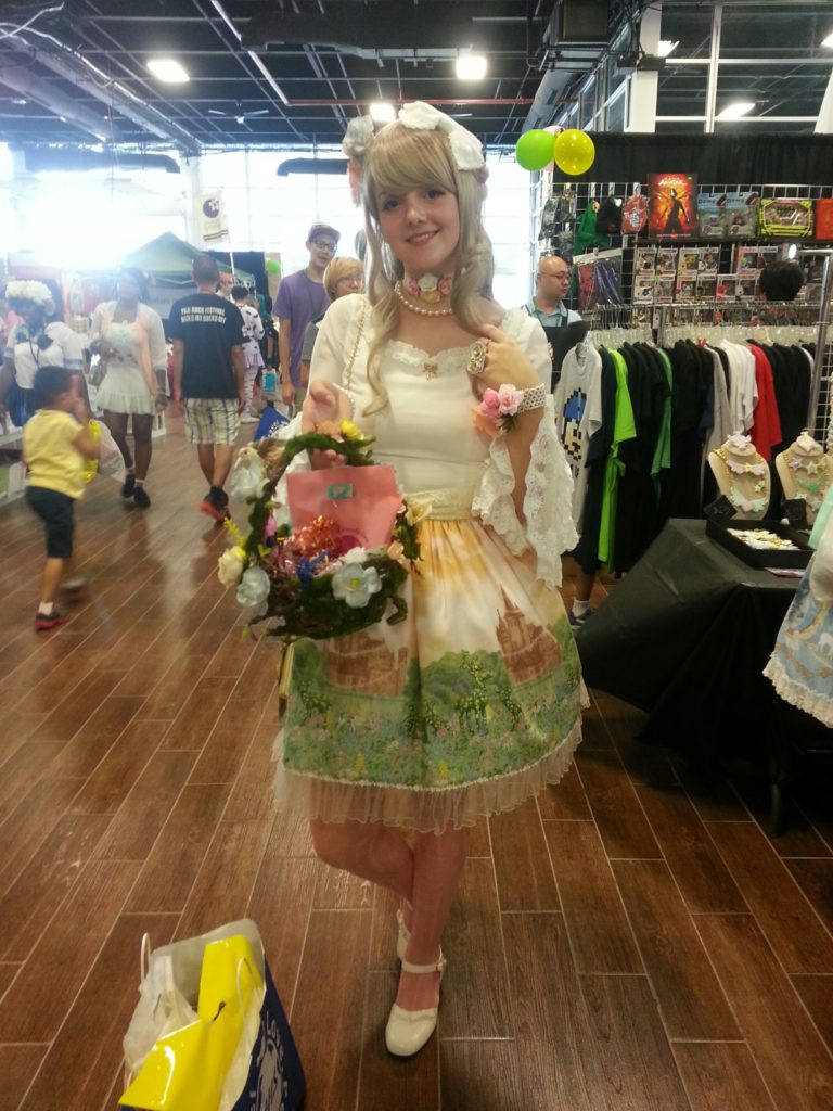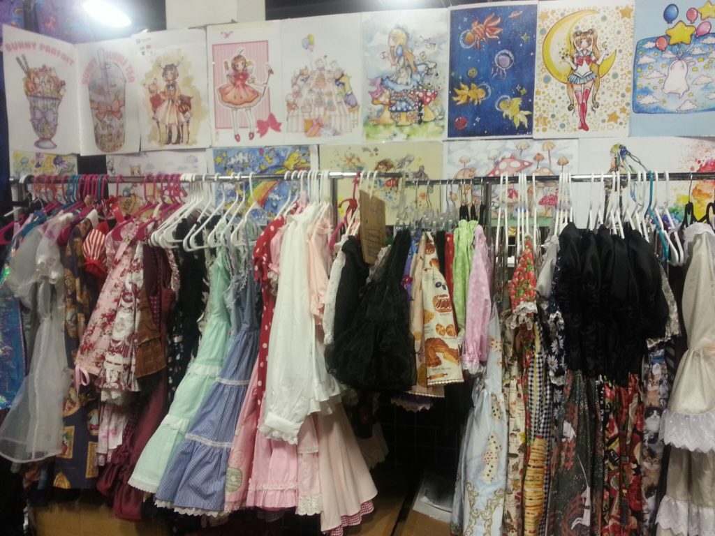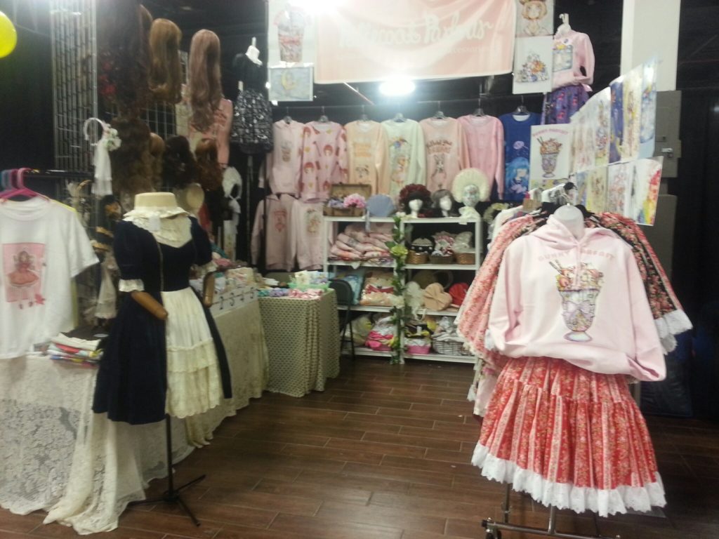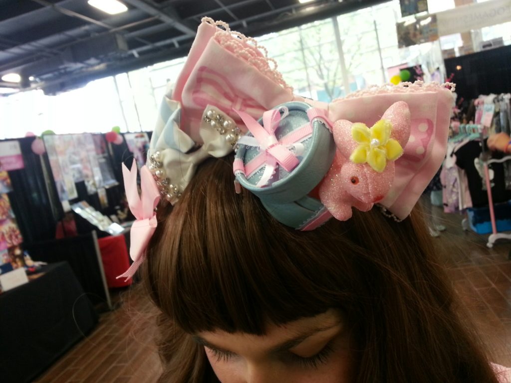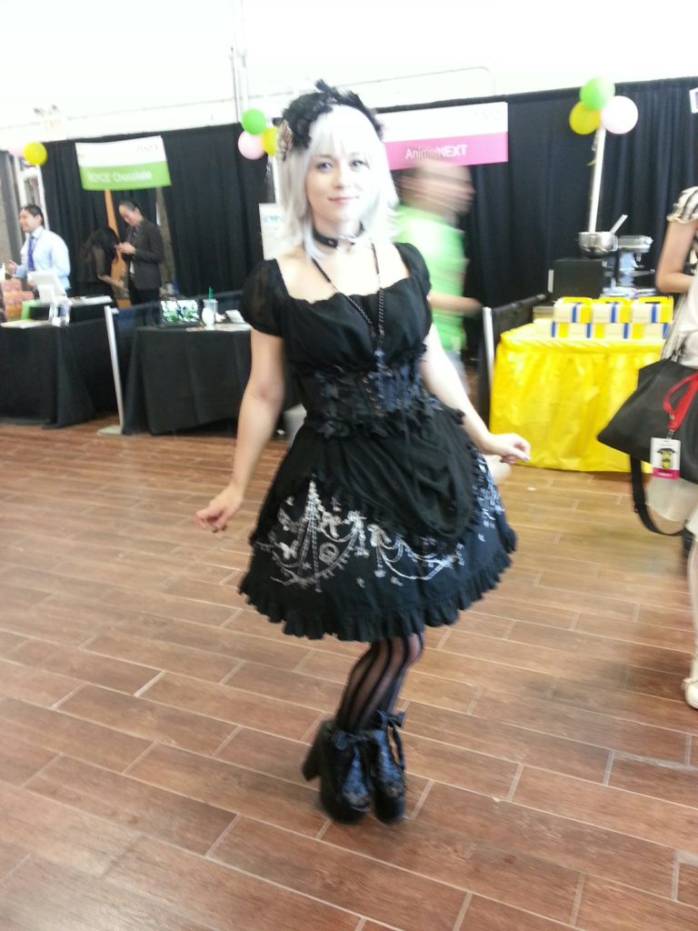 As many of you already know, my girlfriend is one of the designer’s for Bellaonna, so we traveled up to the convention together, and I helped out in the Petticoat Parlor booth, which was selling some of her things. Petticoat Parlor featured items from local indie lolita brands Belladonna and Sweet Mildred, and artwork/stationary/shirts/pillows and accessories from the illustrator Mint and Apple. We also were selling some consignment items, wigs from Brightlele and items from Swimmer.