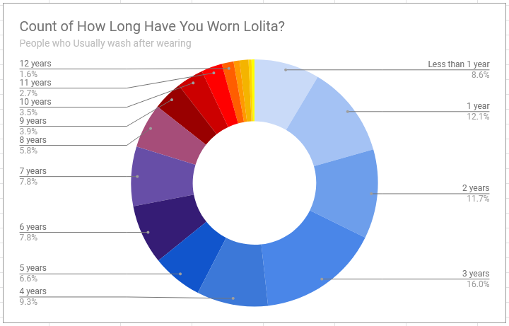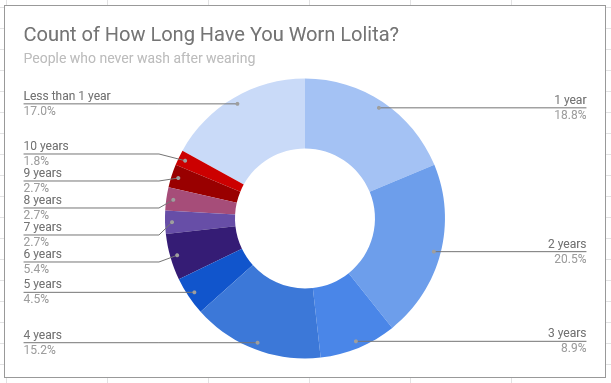 Never washers also tended to have been lolita for 4 years or less, with less than 20% of them being lolita with 5 or more years of experience. The oldest never washer claimed to have been in the fashion for 10 years.