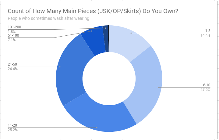 There could also be a small discrepancy simply due to the fact that “sometimes” and “usually” are quite open to interpretation. Both in the context of how regularly people wear their clothes (not everyone who has a lot dresses wears lolita daily and not every infrequent wearer will wear their dresses intensively enough to warrant washing every time) and just the definitions of what people consider to be “sometimes” or “usually”. Would “every second time I wear it” be considered “usually” or “sometimes”? That’s a lot of room for interpretation.