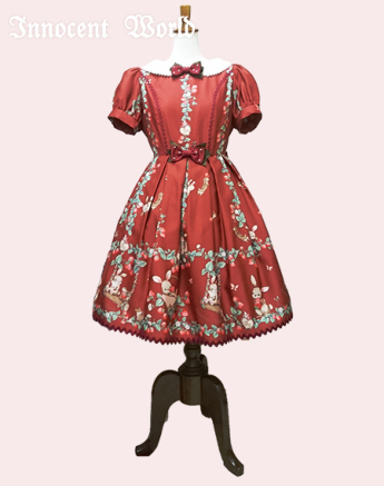 The last release in 2018 was the biggest divergence from the previous three. This release totally changed the artwork, with a much bigger border print. It’s also a much different fabric; instead of the linen-like fabric of earlier releases, this release is in a polyester fabric. This series is still for sale on the Innocent World site, though some cuts/colors/sizes are sold out / low stock. It came in a creamy beige color much closer to the original release, a blue-toned pink and a tomato soup red. There was a JSK, a high waist OP without shirring, and a collared OP without shirring. There was also a ribbon headbow, wristcuffs, and a pair of ankle socks.
