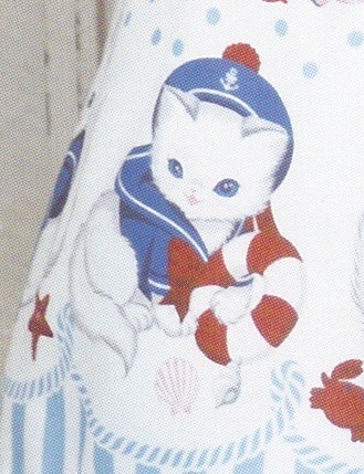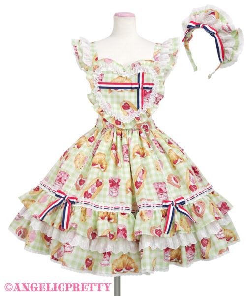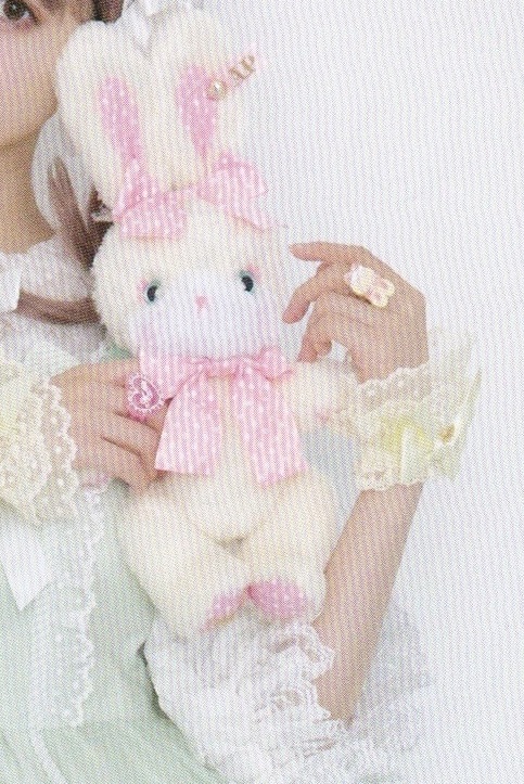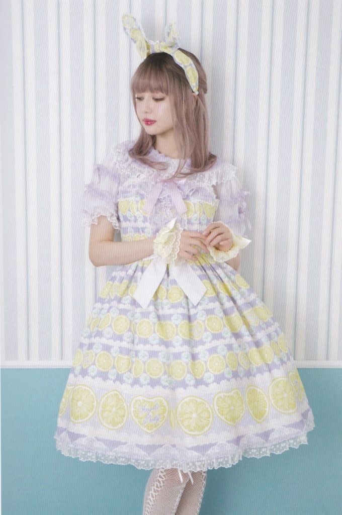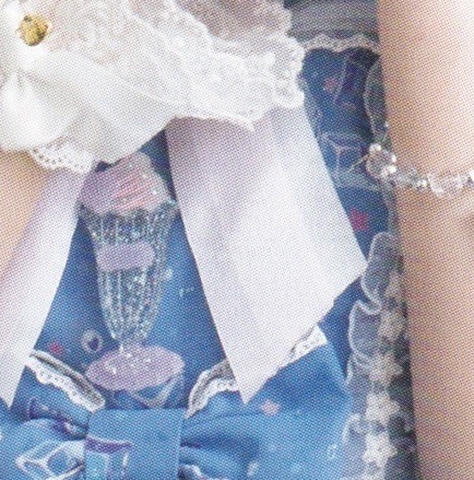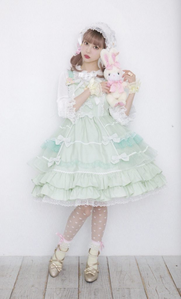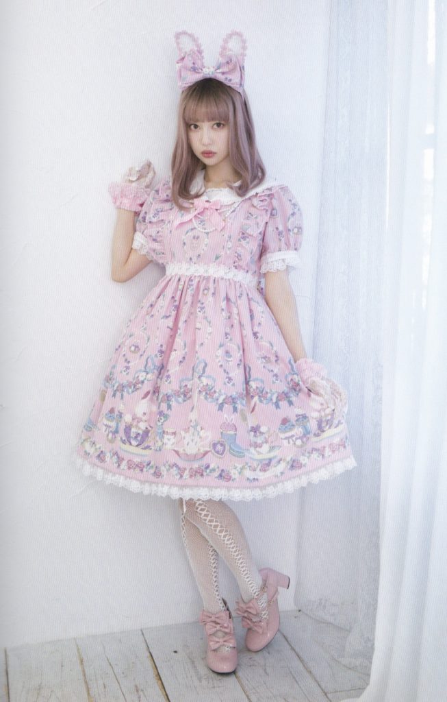 This is cute. I’m more interested in the lyrical bunny accessories than the main JSK, but it’s interesting. It has a nice stripe fabric that is more old school with a more modern organdy… it’s cute.