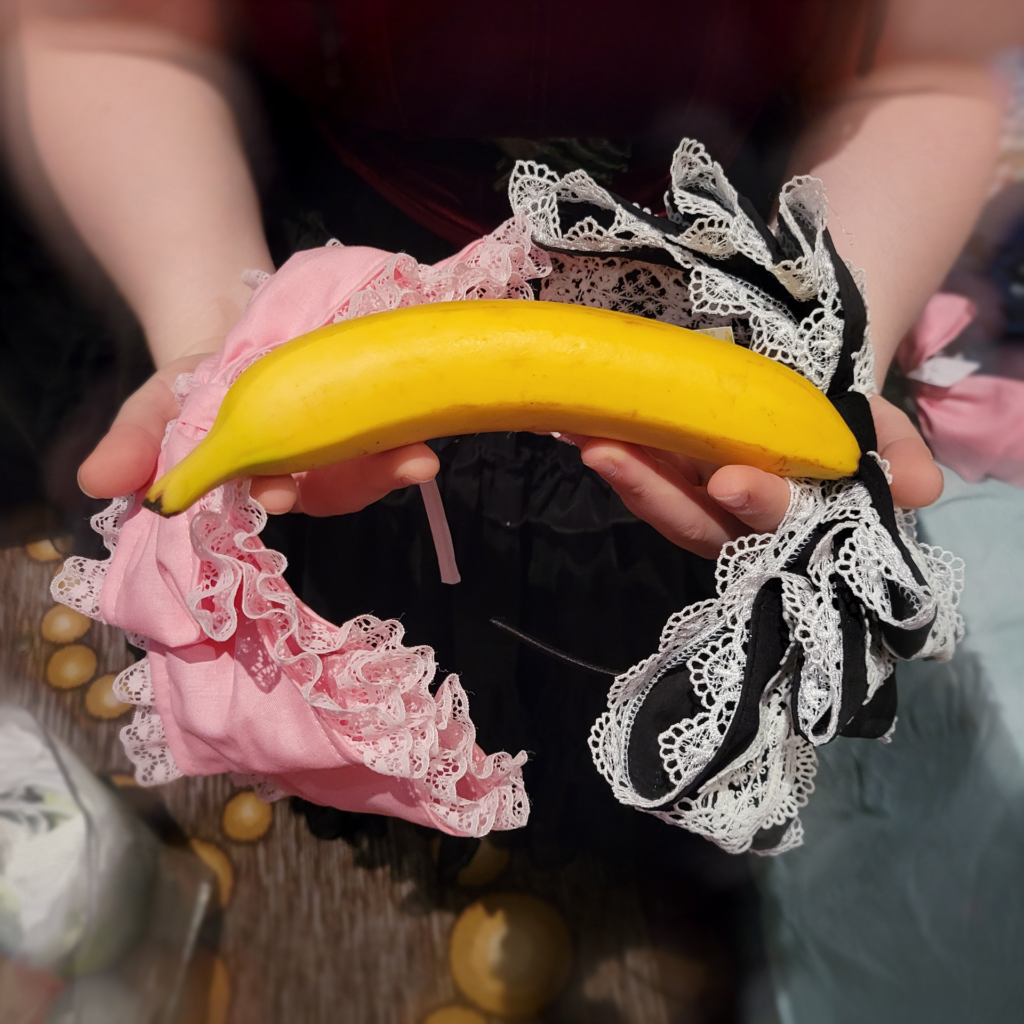 And several wonderful attendees also helped me get general photos of a lolita or jfashion wearing person with a banana… for scale.