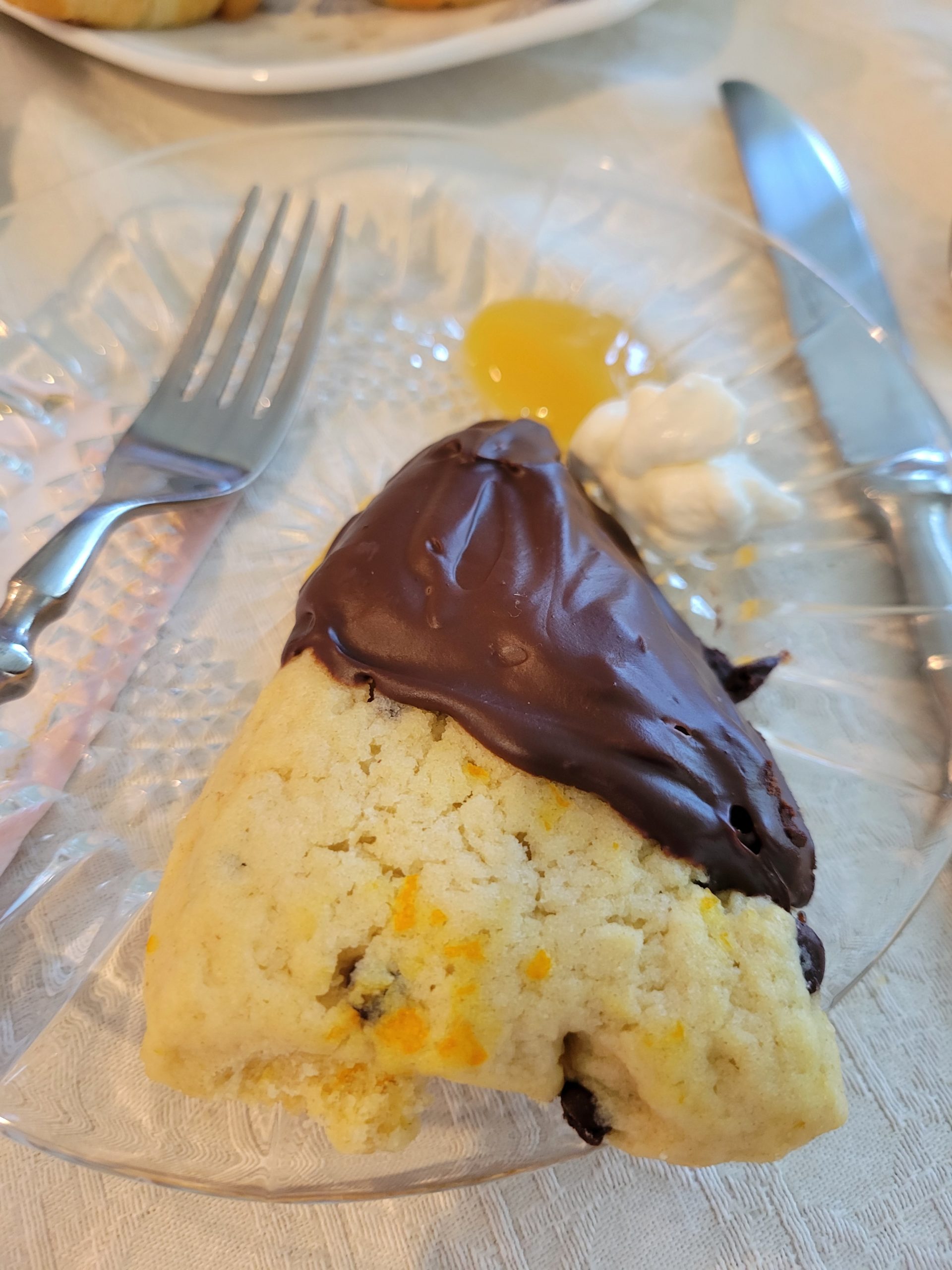 For our scone course, my partner made two types of scones, a blueberry scone and then and orange chocolate chip scone which she dipped in dark chocolate. I love orange and chocolate together, A+ combination, could eat these every day and be happy. We just had some oranges sitting around in the fridge from another recipe that needed using, and chocolate chips and baker’s chocolate left from Christmas cookies, so it was very much a ‘this is in the pantry’ flavor.