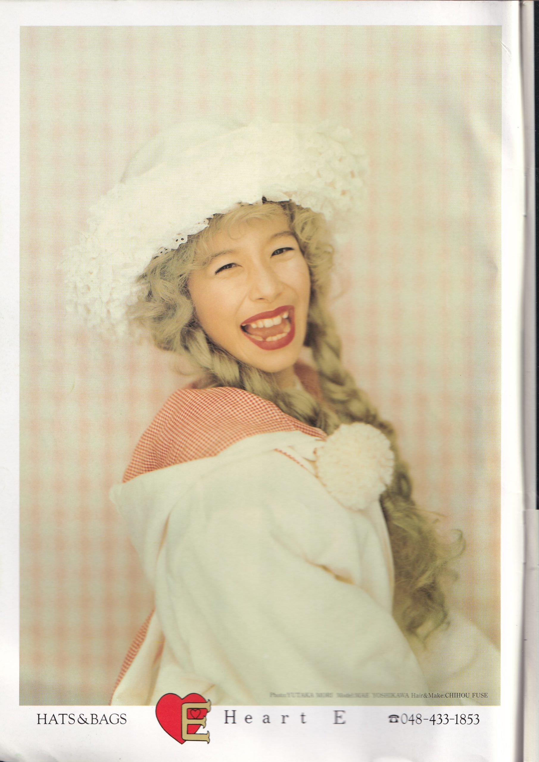 Lastly, these are some heart-e advertisements from 1993. We see one of the hats with the lace on the inside brim that is very bonnet-like. Heart-E continued to make and sell hats like this into the early 2000s, and I wouldn’t be surprised if most of this type of hat that we are going to see later in the 90s is from Heart-E. The center advert shows berets and pompom and strawberry hair ties, and the last image is again a beret.