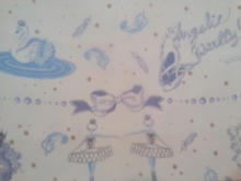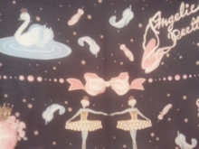 When these came out, I know I was squinting at them trying to figure out the print (I cam up with Ballerinas and pairs of ballerinas, and feathers but couldn’t see much more than that!) It turns out that there are swans, feathers, dots, ballerinas, ballet shoes, Angelic Pretty’s name, ribbons, as well as what looks like some sort of gem, crest or egg with a crown on it.
