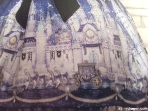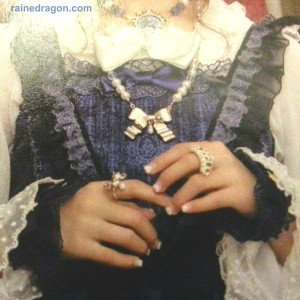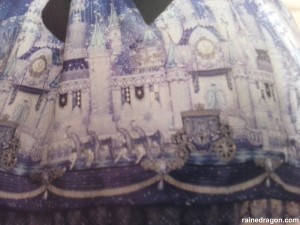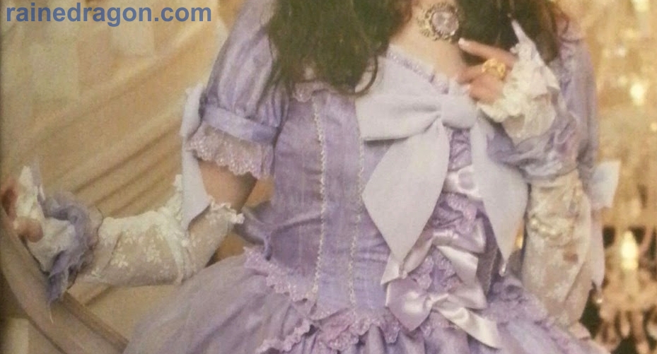 Unfortunately, if you were in love with the pieces from the fashion show you will be in for a bit of a let down. First of all the dark-on-sax with navy trim colorway pictured in the fashion show is no where to be found. Missing as well is the whole male ensemble. There is a slightly different version of the complex OP worn in the show, called Castle Mirage Dress. The fashion show dress has different lace, and an extra tier of lace at the hem. It also features pearl accents that aren’t on the final piece. The bows seem to be made a little differently as well (perhaps a different material?