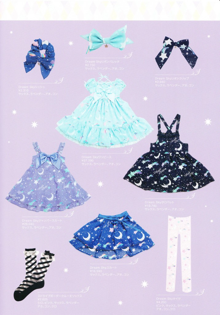 Now, let’s talk about this model for a second. She is wearing Dream Sky Ribbon Clip, Glass Doll Cutsew, Dream Star Necklace, Dream Sky Jumper Skirt, Melty Moon Shoulder Bag, Dream Sky Scrunchie, Magical Moon Ring, Pinstripe Border Crew Socks, a pair of shoes and then it looks like the last line is something about accessories.