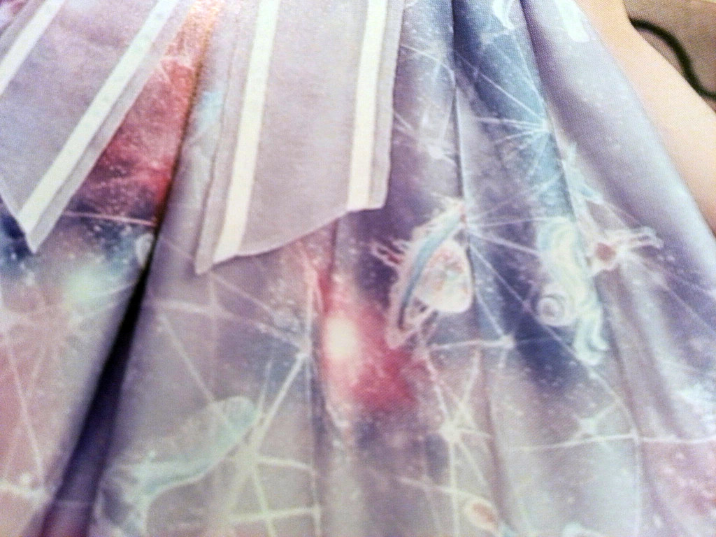It’s getting warm again in the northern hemisphere, and AP is gearing up for summer. The last few years have brought us a chiffon sky print pretty much every summer, and this summer looks to be the same. Slated for late June, Dreamy Planetarium combines the galaxy print look that has been trending the past few seasons and overlays it with lines that look vaguely like constellation maps and faint glowing animals that are reminiscent of traditional illustrations of constellations. The print appears to have a ram, bird, unicorn, tanuki, shooting star, drippy planet Saturn and possibly a cat of some sort.