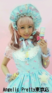 But it’s just the– rattle and the yoke and the big round adult baby bonnet. I’m not fond of the colourways either. I quite like the Toy Parade OP in white because if you put it with some elegant long ringlets, crochet tights, and pretty heels, it could look a bit more grown up and couture– I think nearly all prints look more elegant in white– but the pastel overload of the colourways for Dreamy Baby Room have no leeway at all for elegance, and besides, they’re just boring. AP was doing really well with unusual colours like those bright blues and reds and greens up until now. The cut kind of blends in with every other pastel blob print AP have ever released. too.
