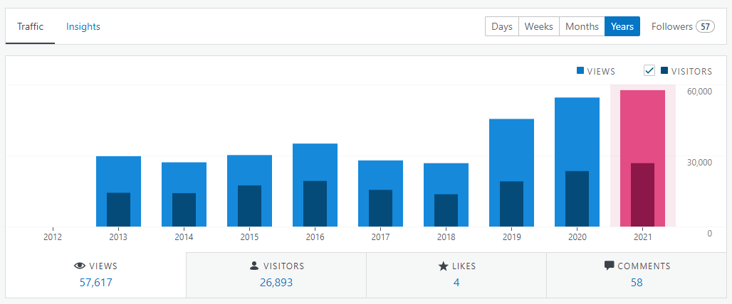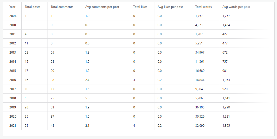 I’m a bit of a nerd when it comes to statistics, so just for fun, and because I like to make data more available, here are the stats for my blog since I first started tracking them in 2013 (the data at the bottom is just 2021).