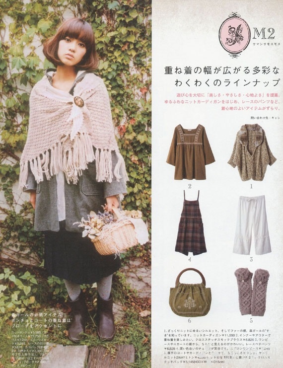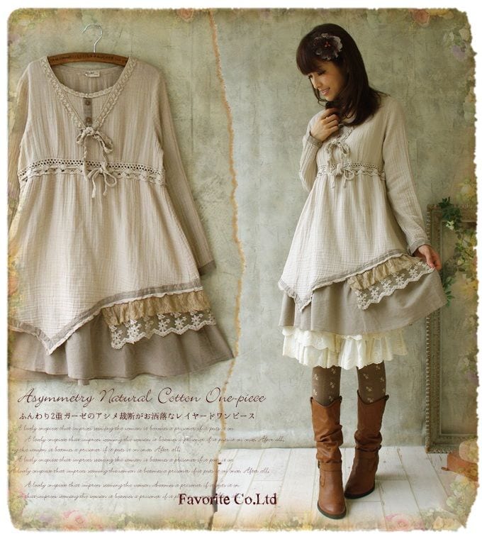 Mori Girl, like lolita (more on that some other day) is a style name that was laid on top of existing brands and styles. Unlike lolita, Mori Girl has always had a very defined “lifestyle” that is a big part of the style. Mori Girl is often said to have started on Mixi in 2006, with a list that was basically “you might be a mori girl if you….”. To make a very sweeping generalization, Mori is defined as a style that uses natural fabrics, neutral colors and layers to evoke a romantic, vintage, forest maiden type of vibe. The mori blog “I don’t know much but I’m learning” has a great “What is Mori Girl” article. Mori Girl, while a lovely style, is considered to have come and gone in Japan, and likely isn’t influencing this current trend. (Also, I don’t wear mori girl, and am not an expert on the subject)