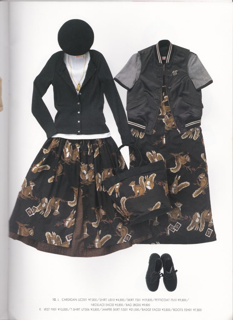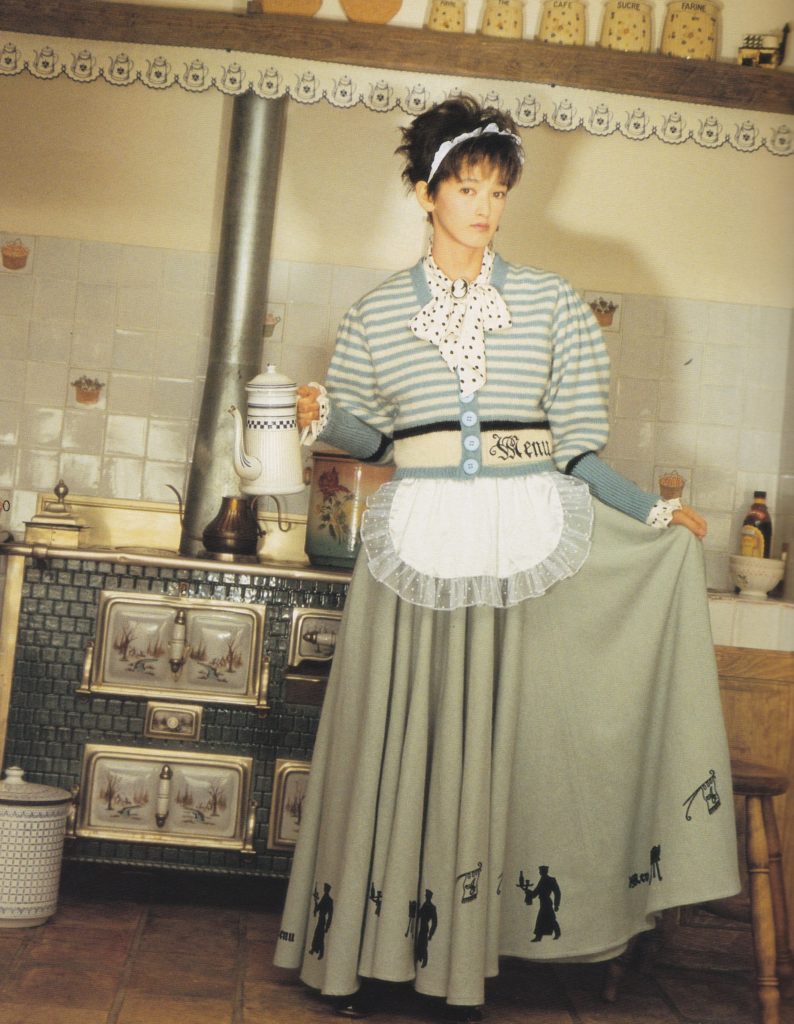 Atsuki Onishi, aka AO, is a now defunct. Their style in the catalogs I have from the mid 1990s is closer to Kaneko-kei than to lolita to me, but some of their 1980s items wouldn’t look out of place as modern lolita, like the floral skirt shown below. There is also a heavy use of fairy tale motifs. One thing I particularly find interesting is that the 1980s work that looks more lolita to me is from the era when Isobe-san of Baby the Stars Shine Bright was designing for the brand.