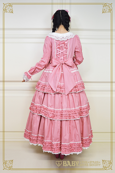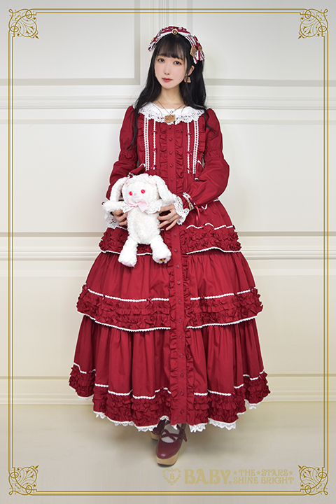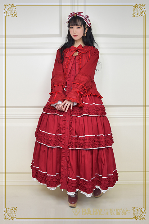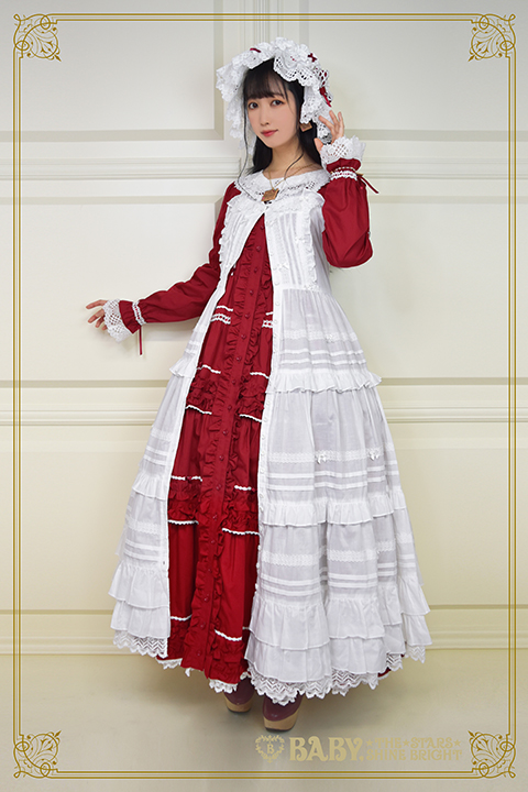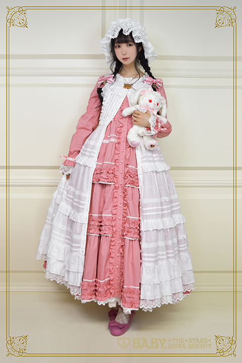 There is a long JSK (37,800円) which sold out in every color except ivory. They show it modeled over the OP, forget the matching blouse (which they layer over things anyways), this is a JSK over OP situation. which, yeah, that’s how you wear kaneko-kei style JSKs. You layer over an OP or a skirt-blouse combo, but it’s still wild to see baby just styling a JSK like it’s basically a duster jacket.