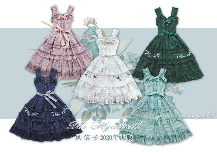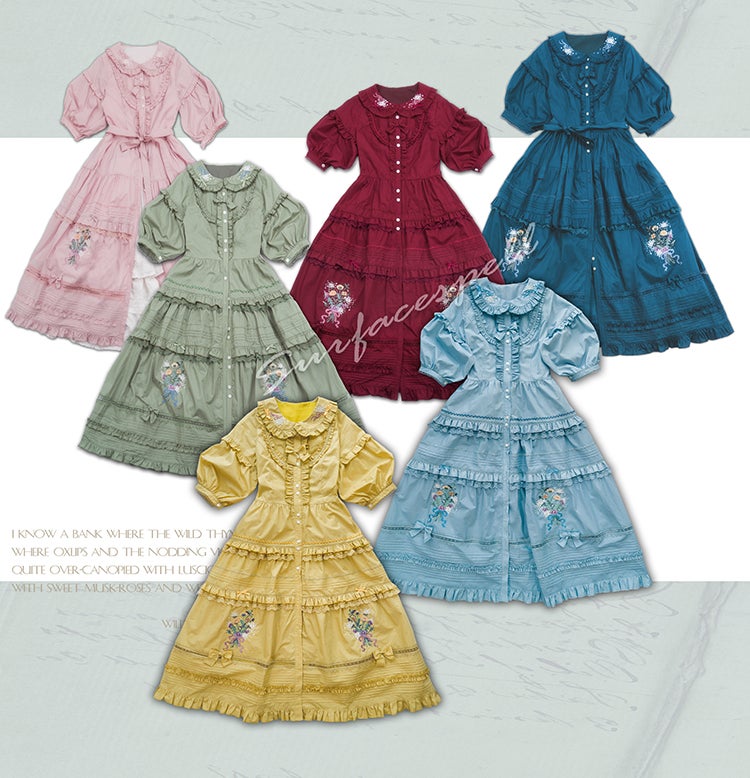 In 2017, Surface spell released I don’t want to be Anne of Green Gables, followed by this beautiful “A Bank Where The Wild Thyme Blows” series that looks like it waltzed out of a Pink House Catalog in early 2021. The details! The embroidery! I have a Pink House Skirt with flower embroidery around the hem that would be perfectly at home with this series. And in 2020, Surface Spell put out their “Hyacinth” Lily of the Valley series. Surface Spell has a long history of working with embroidery, but a lot of their stuff before this had been more formal, there were velveteens, there were royalty motifs…