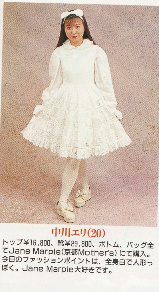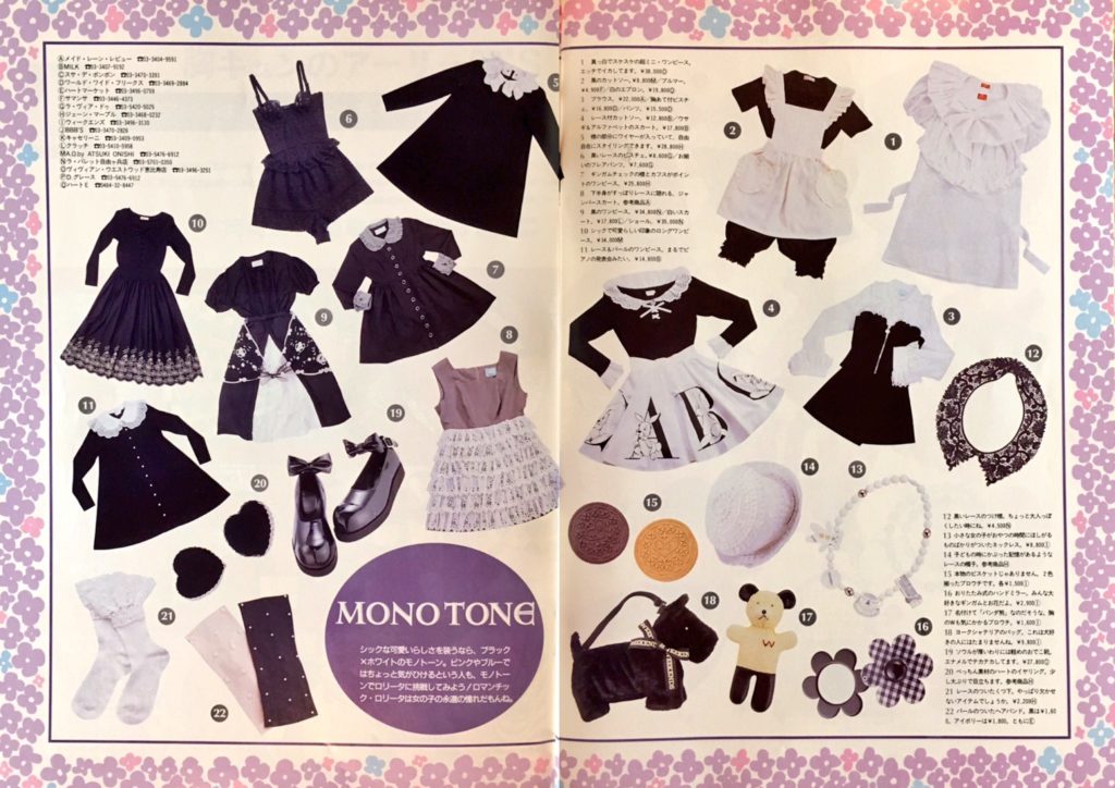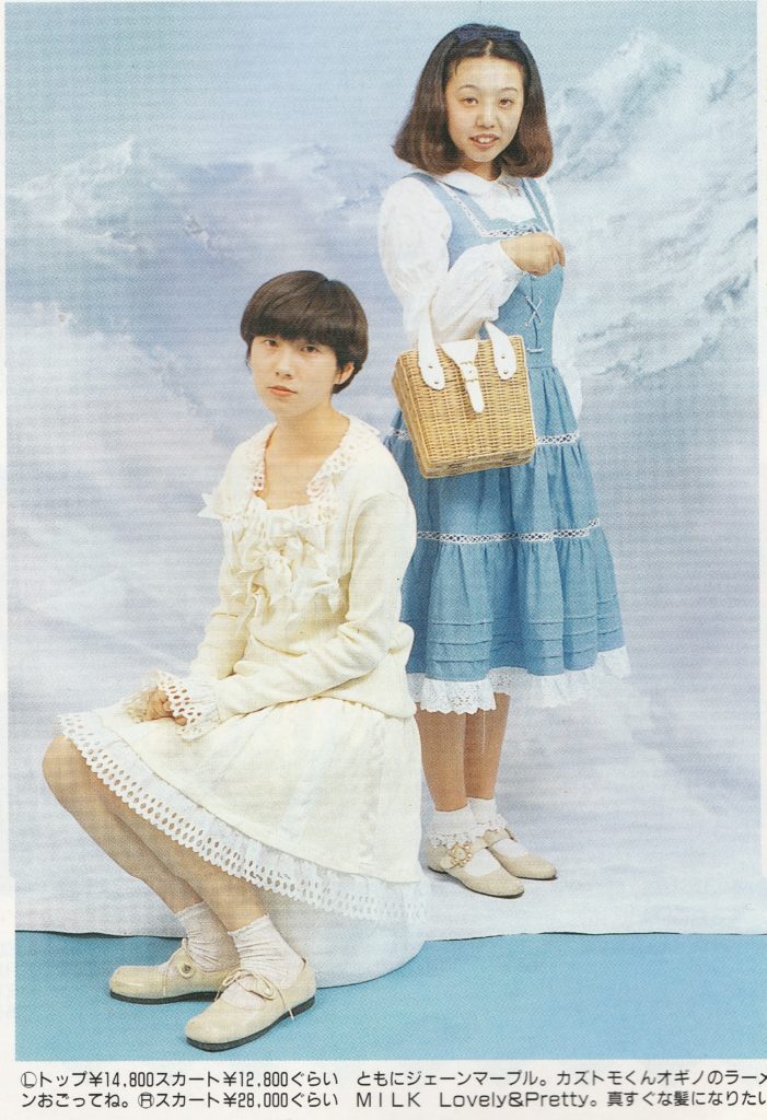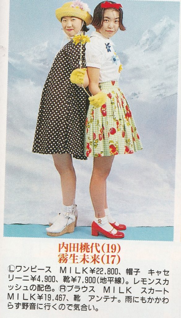 As for AO and MILK, in 1994, Zipper magazine published an article talking about what lolita fashion was and the origins of the style. In that piece they interview people from AO and MILK, citing them as being lolita brands. (Interestingly, the PR person for MILK at the time replies back that what people are calling lolita at that time is just the style MILK has always made…). And, slightly before that, in 1993, Cutie Magazine published some spreads that showed what they considered lolita fashion. Items from MILK and AO were again included.