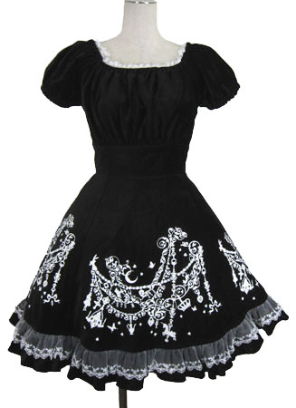 I got the black x white because it was all they had left. The back ties are white, and a cheap satin sort of material that looks (and feels) terrible. The material is a sort of velveteen that is very, very short, and sort of stiff. The skirt can barely accommodate a little bodyline panier, and is short on me (I’m 5’3″). It looks a bit maid-costume-y. The print is screen-toned on and seems a little clumpy. I guess there is a reason it was on clearance.