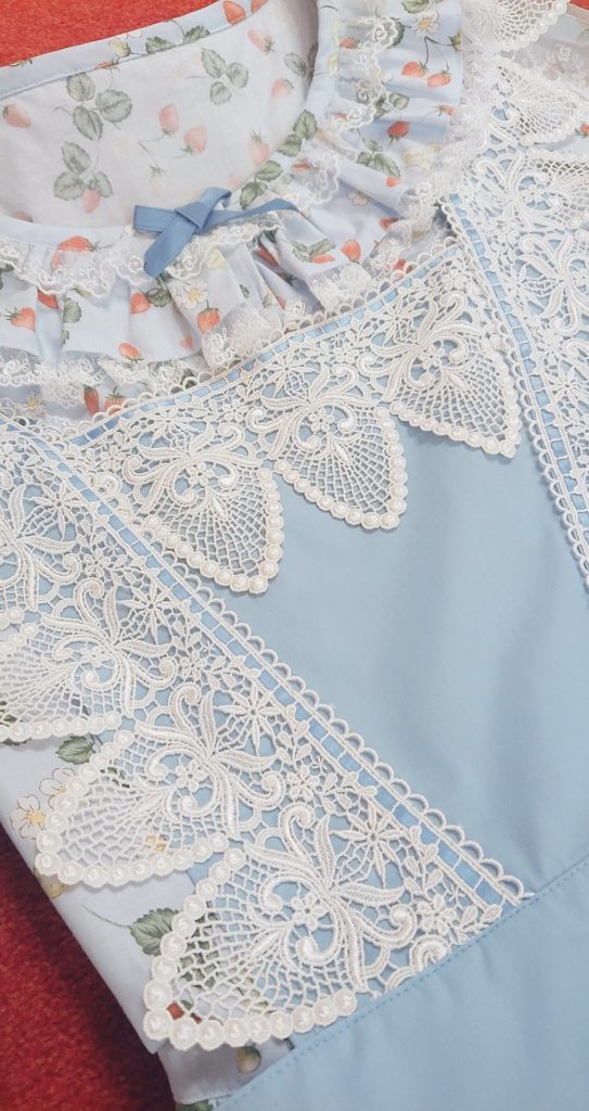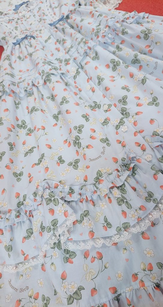 Wow. First of all, wow, just wow. This is a lot of dress, with a lot of details. It’s very much on the Kaneko-Kei trend bandwagon and I love it. The lace inserts in the sleeves are elegant and bring it back a little bit more strongly to lolita / innocent world, but I am loving the button front detail, the scallop ruffles and the bustle ties. Super, super cute, very detailed.