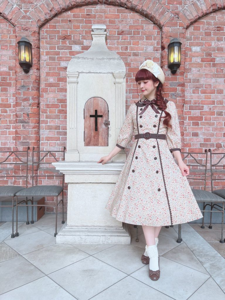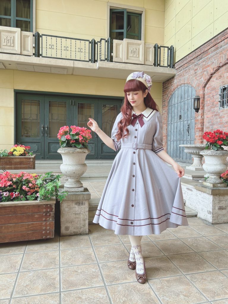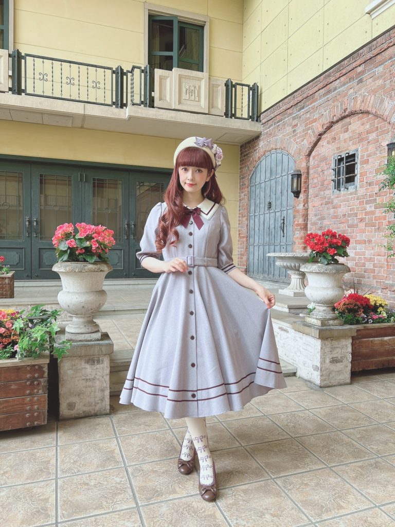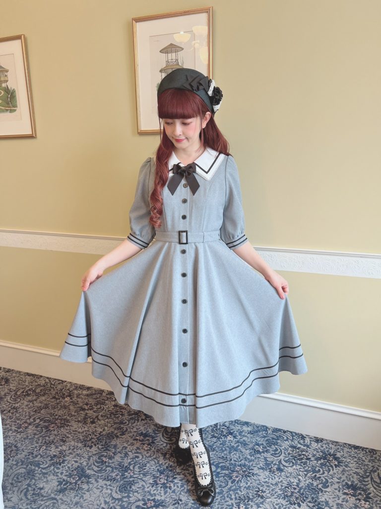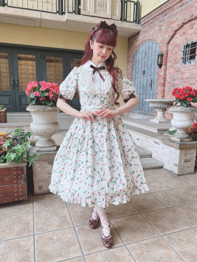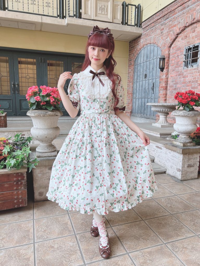 This sort of brown quilt floral is not my cup of tea. I don’t really love it in quilts and I love it less as clothing. The dress cut is cute, but I’m not personally feeling the print. I feel like this is probably the most likely design to end up on the sale racks, if anything lasts that long. It looks to be almost identical to the Luna OP, (which is sold out in every color except for Green in size L), and I like it much better as a solid. Paired again with the Romance Ribbon Hat and some cute ankle socks. I personally am not feeling the ankle socks with this, but, it may just be because this dress isn’t to my taste.