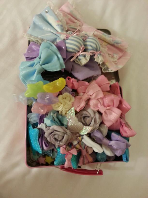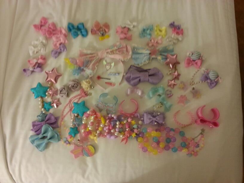 - Angelic Pretty: JSK, Headbow, and Barrette, OTKs, Bag (from the Lyrical Party Special Set), Star Necklace, Star Bracelet, Bowtie, Heart Ring, Petticoat (2), Candy Brooch, Candy Bangle, Star Bangle, Bow Bangle