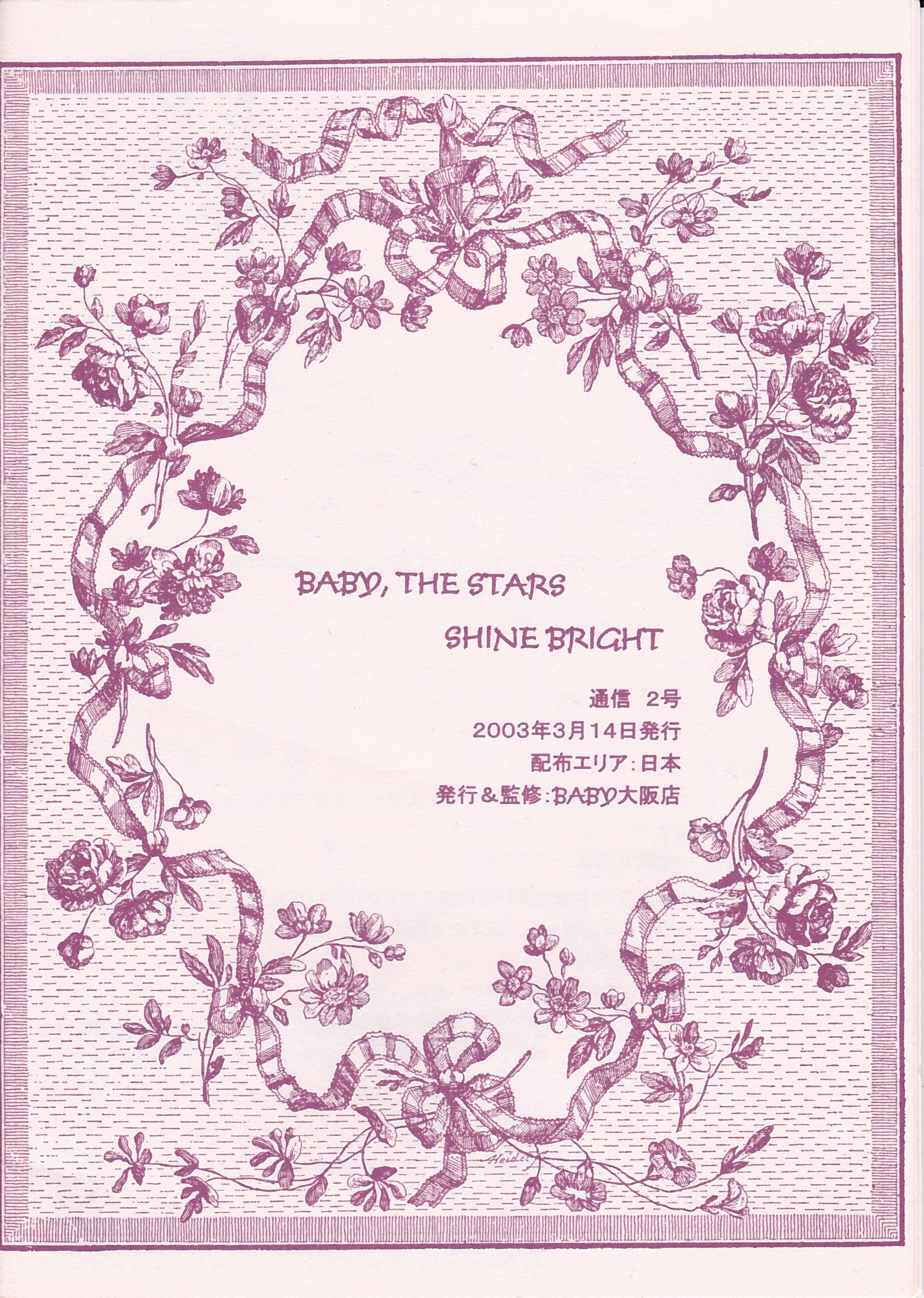March 2003 Baby the Stars Shine Bright Catalog. Magenta ink on pink card stock paper. A shop assistant has marked the local shop where this was given to the customer on back cover with a pink gel pen.