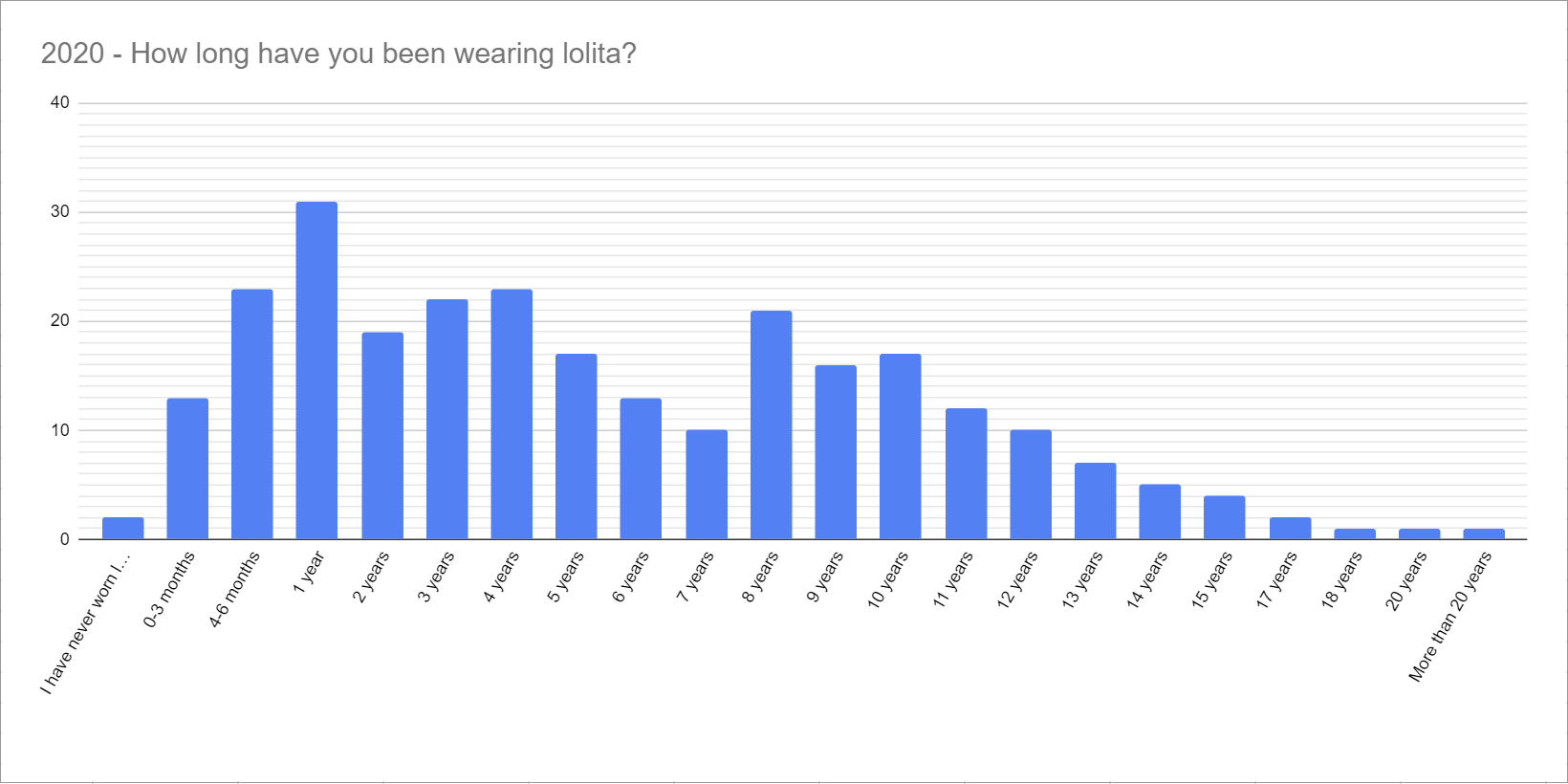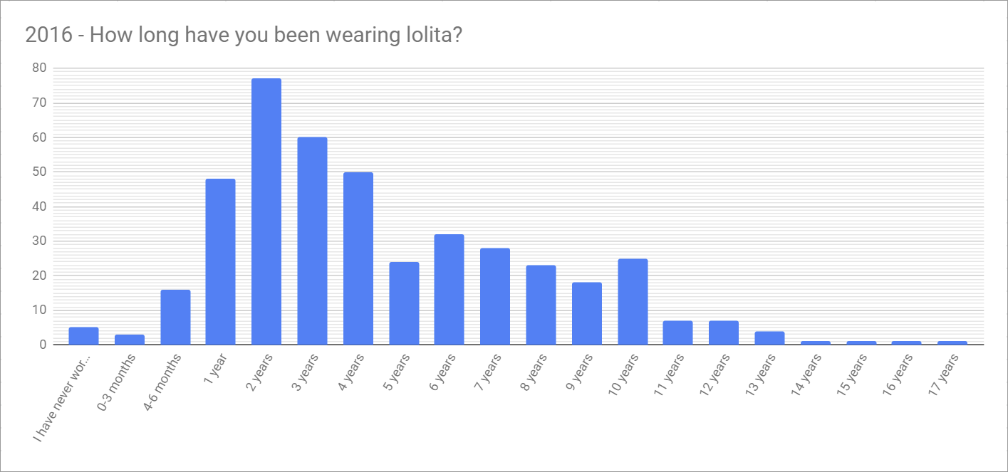 The graph from 2016 also is heavy on the newer lolita, with 209 (~49%) of them having worn the fashion for 3 years or less.