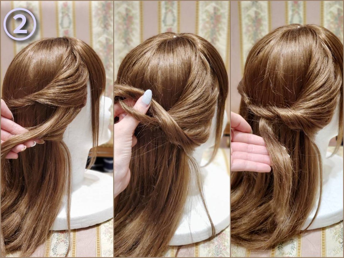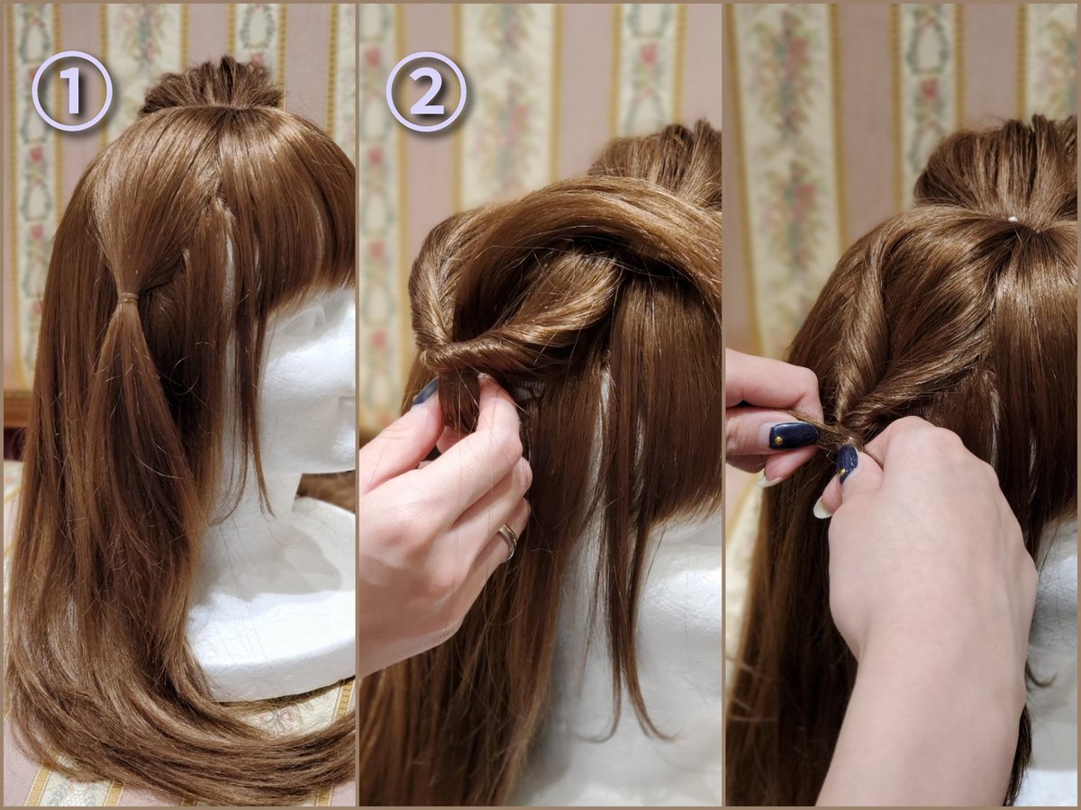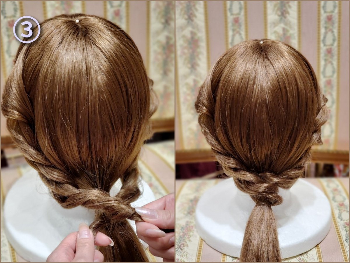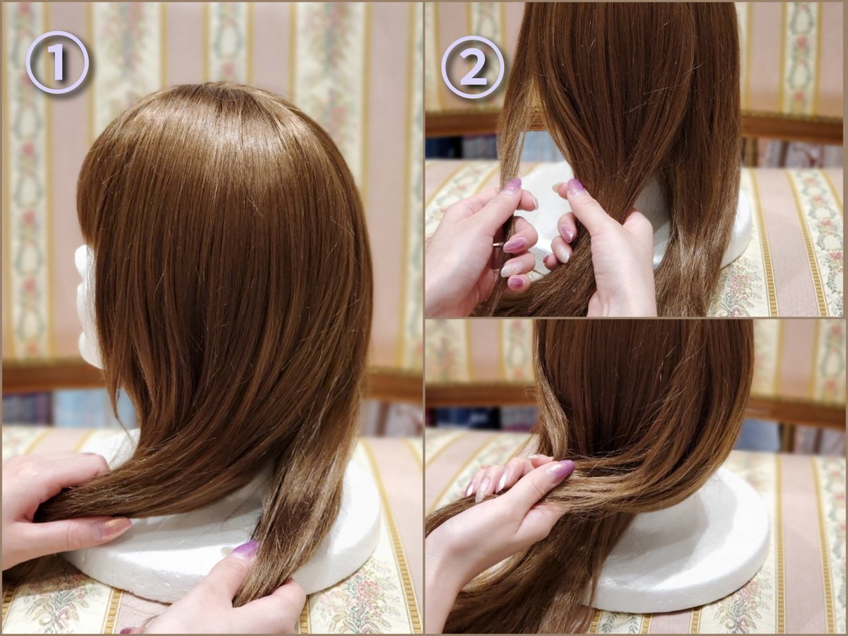 ③ If you can do the opposite, cross the hair bundles and turn the hair ends behind the hair bundle of ① and tie ① and ② together.