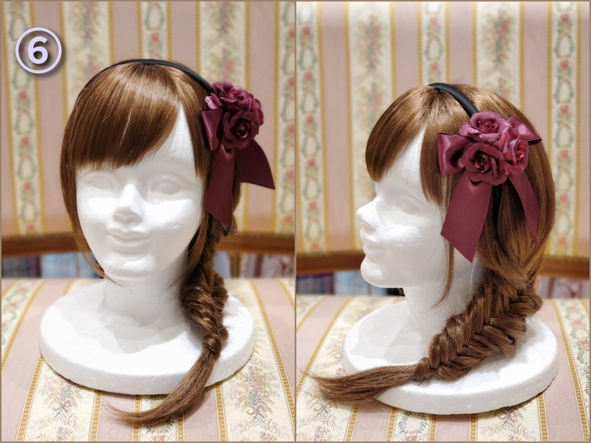 ⑥ ④も同様に留める ⑦カチューシャをつけて完成