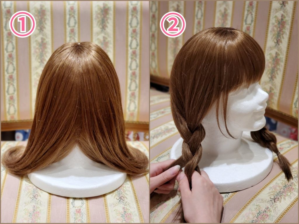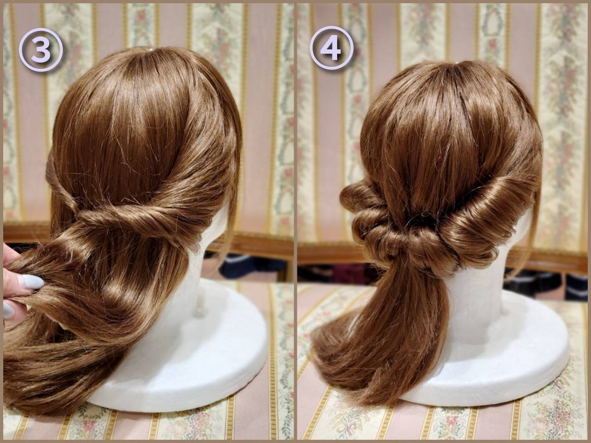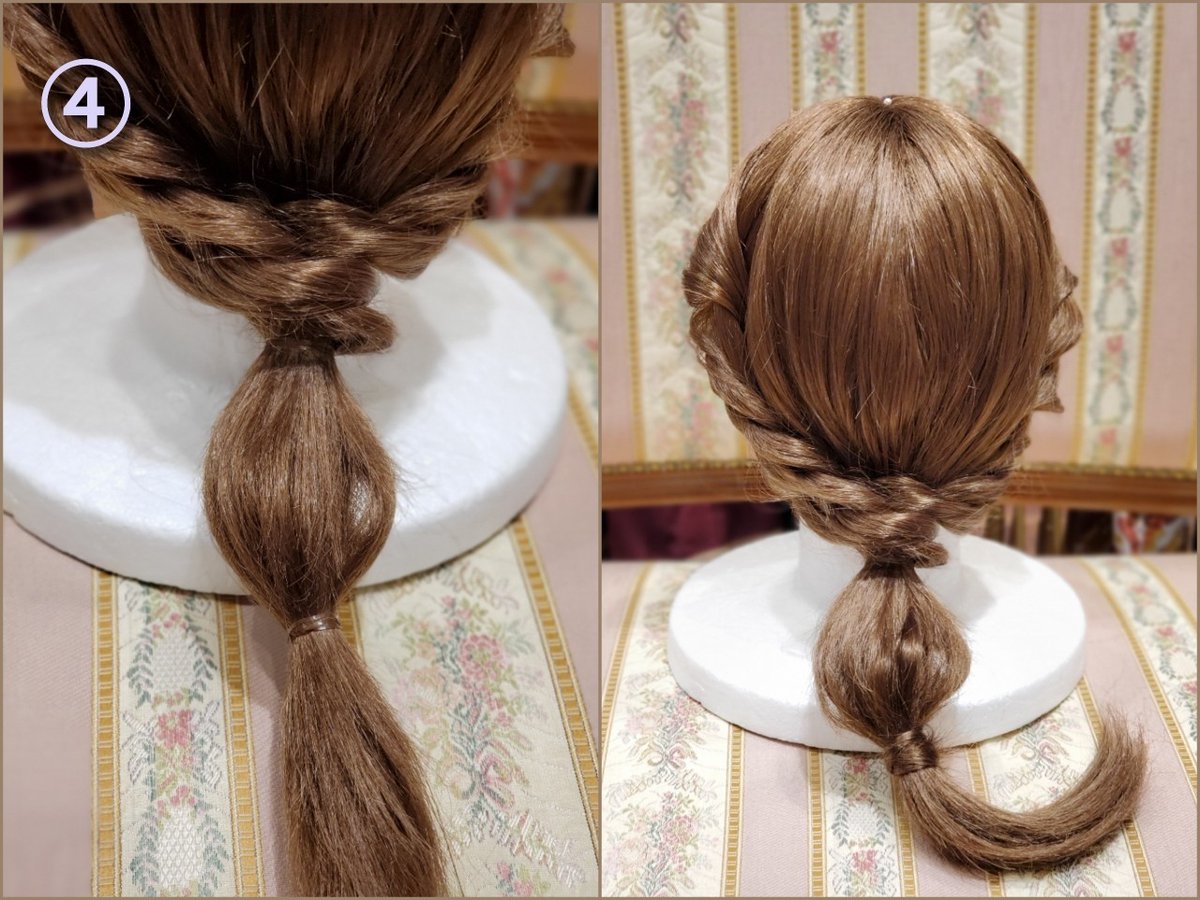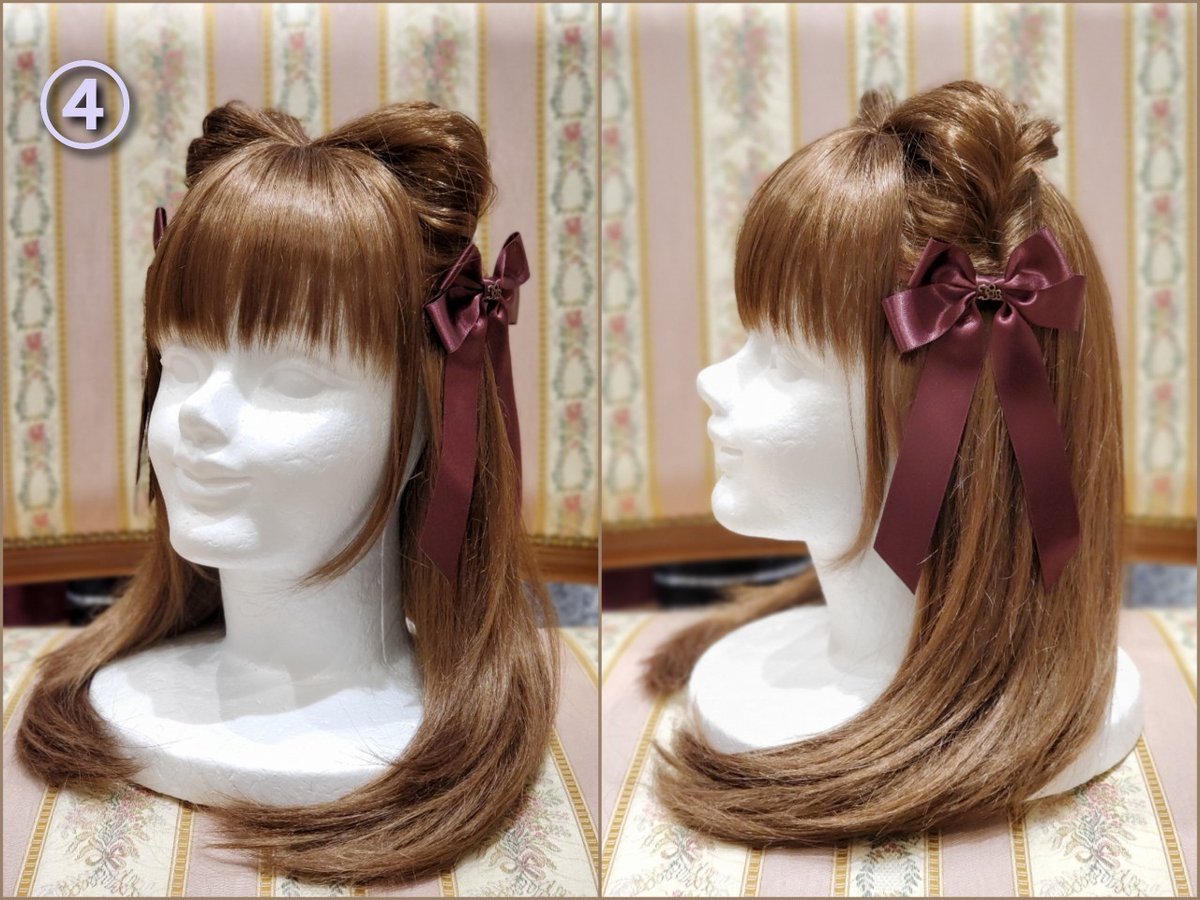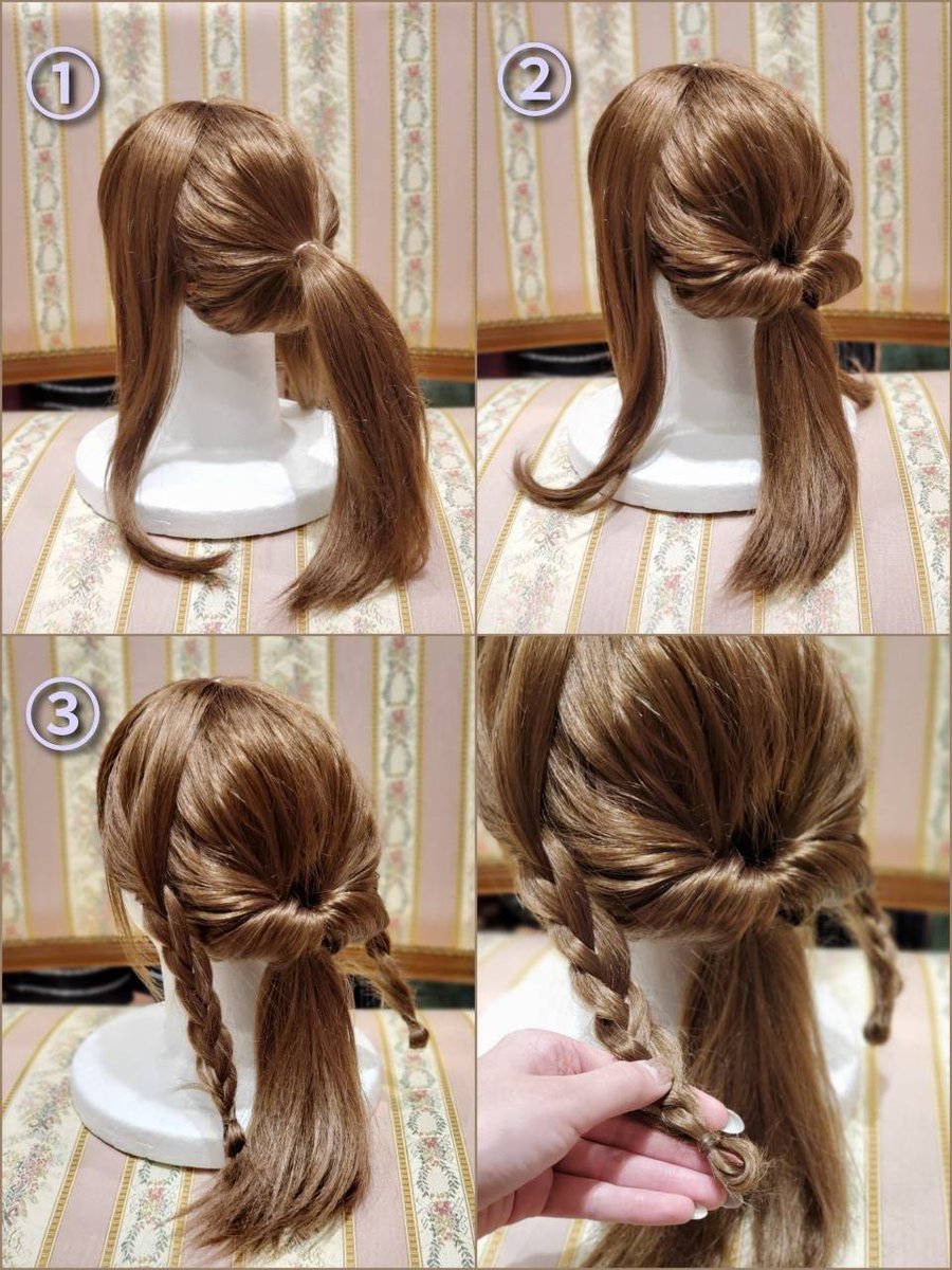 ③ Divide the twisted hair into two sections, braid each section, and join the ends together to form a braid. ④ Add a ribbon to finish.