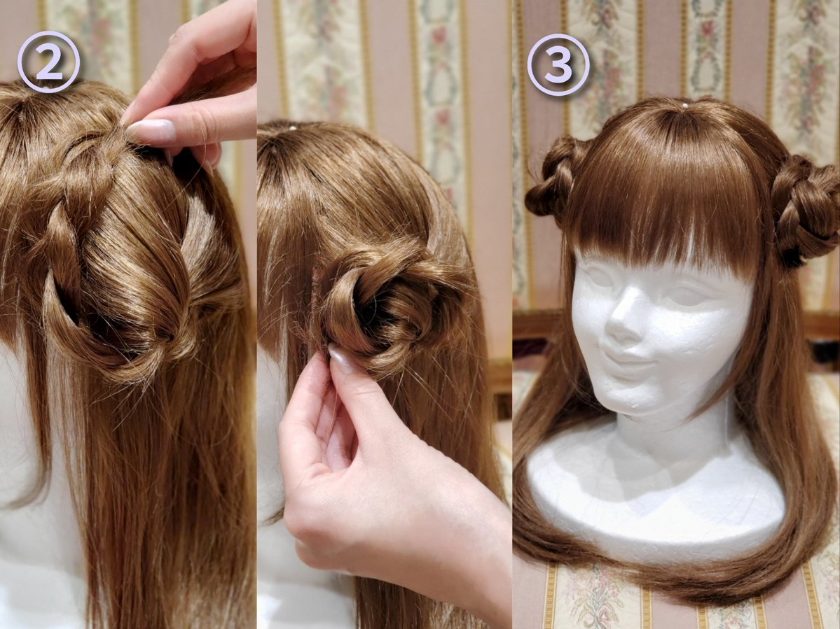 ③ When you tie ②, make a bun and divide the ends of your hair into two.