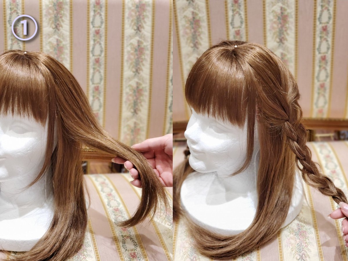 ①耳上の毛束を少しとり緩く三つ編み