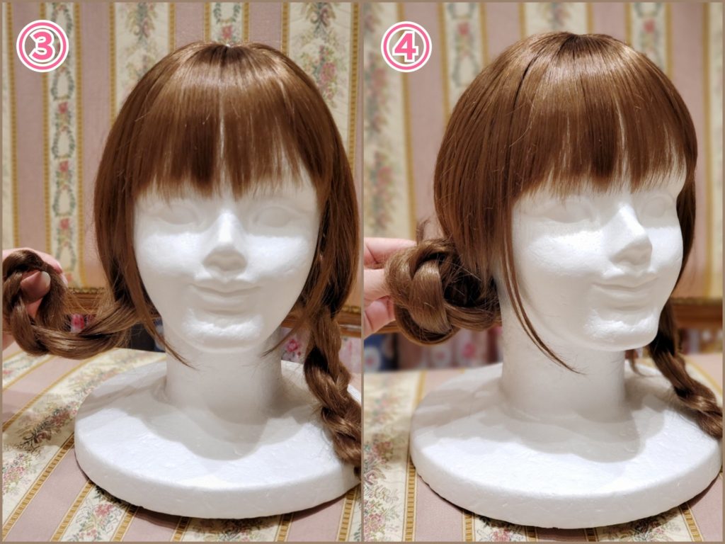 ③残したサイドの毛束を三編みしピンで留めやすい様に毛先を丸く結ぶ