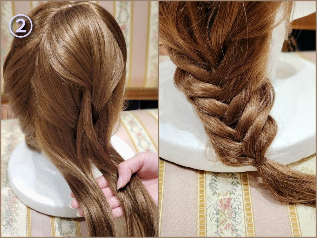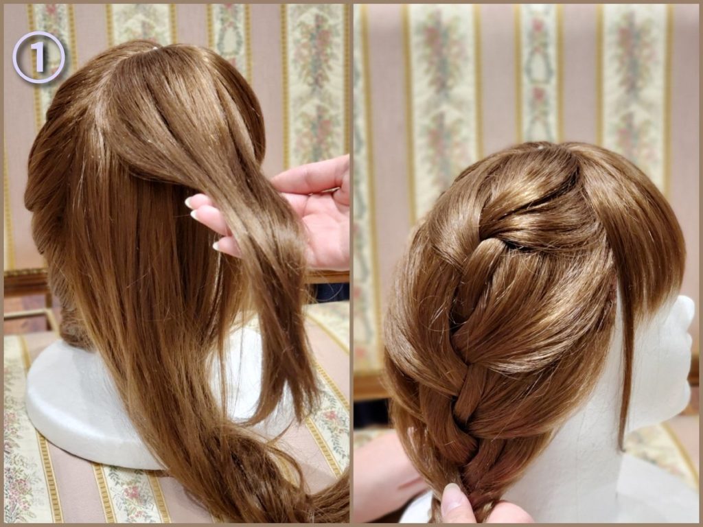 ① Take a little hair on one side and braid it backwards while scooping the hair on the bottom