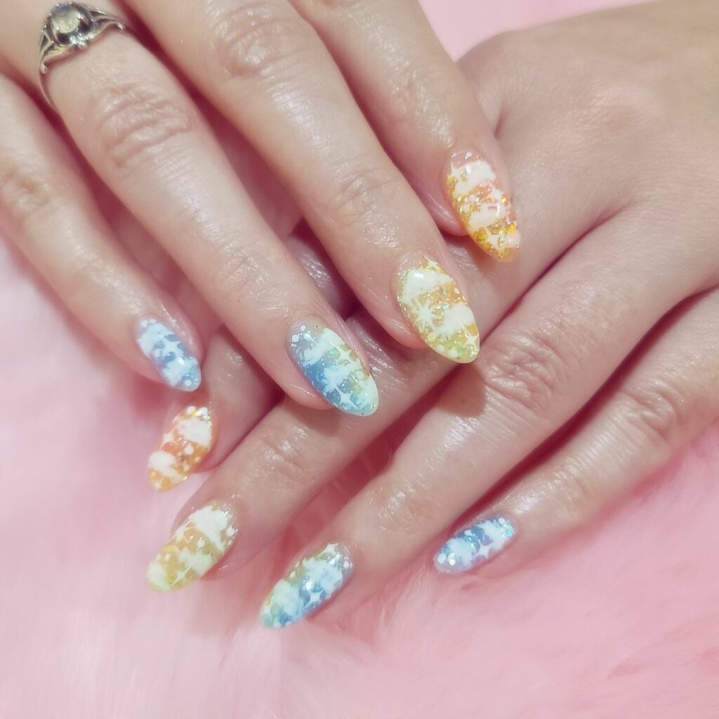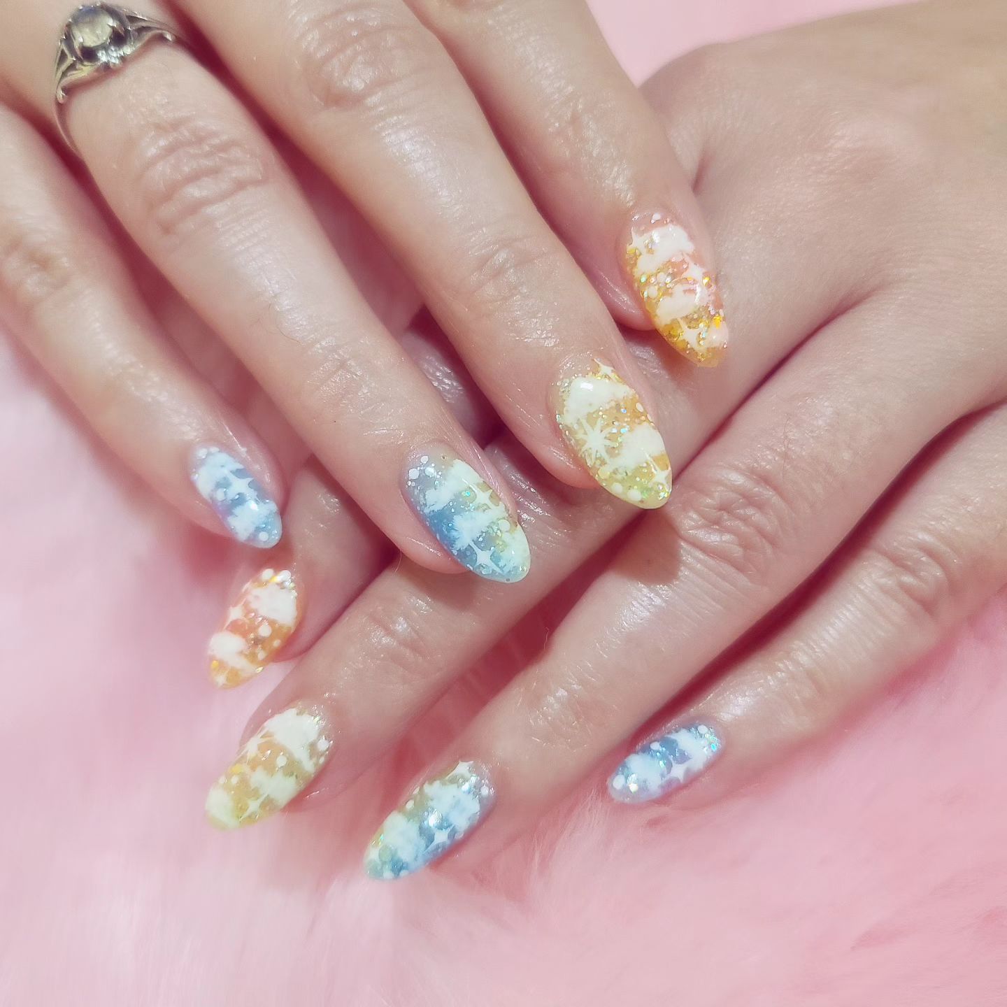 Earlier this year, I had pastel rainbow skies. I really like the look of white on top of cute colors like this. Michelle describes this as a ‘Vertical jelly glitter ombre with clouds and stars’ and wrote that this was a ‘Gel Manicure with Advanced Nail Art (and removal) 1.25hrs’.