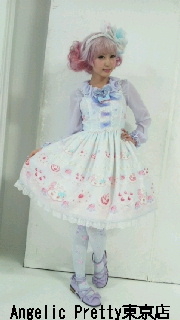 It’s another cake print, in chiffon, in pastels, and all in all, I’m not really wowed by this one. In fact, it was in the GLB #47 and I thought it was a Baby, the Stars Shine Bright print at first and just ignored it. There is a high-waist JSK, a normal JSK (though it has some funky bows up the front) and a drop-waist miniskirt, as well as over the knee socks (ivory, pink, yellow, sax, and mint), a head bow, and tights. I don’t really see this being super popular.
