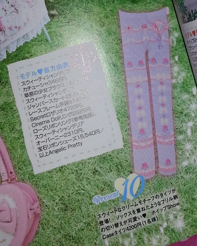 I think the tights are going to be big though, since print tights are in, hard to find elsewhere, and there aren’t a lot of options yet. So I can see a lot of sweet lolita trying to get a pair of these to match up with older AP and BTSSB prints. It looks like they come in Ivory (shown on the preview sheet), pink, and lavender which is shown in the image from the GLB:
