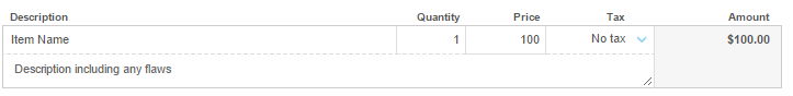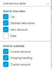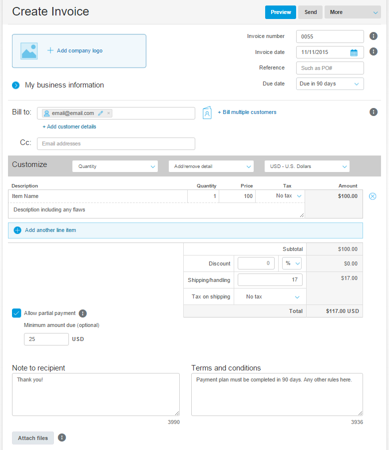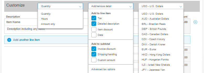 The customize bar lets you change what options are on your invoice. If you have decided to do a non-refundable deposit, you want to turn on “Item discount” and “custom amount” from the add/remove detail menu. Otherwise, keep the options shown, though you can remove “tax” if you want. The currency field is useful if you decided with your buyer that the invoice would be in a different currency. DO NOT spring this on them without asking though, buyers will get upset if they have to suddenly pay a currency conversion fee with their bank!