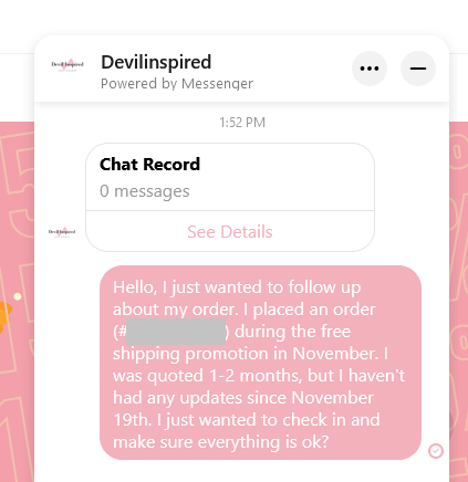 Still no reply on February 24th, so I reached out via their chat. It’s a Wednesday, so in theory, it’s a work day no matter what time zone we are in. I sent the message at 2pm local time, which is like 3am in China. So, an immediate response probably isn’t on the table.. but because it’s tied into Facebook messenger, they should get it on Thursday morning when they come in for work right?