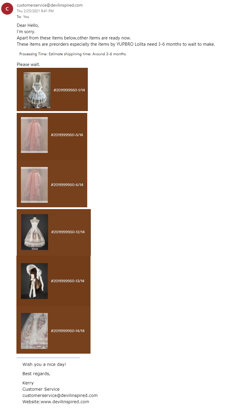 They never answered me about the second order, which is not what I expect. My normal shopping service always “gets the last word”: my normal shopping service will confirm they read your message, even if your message is a confirmation.