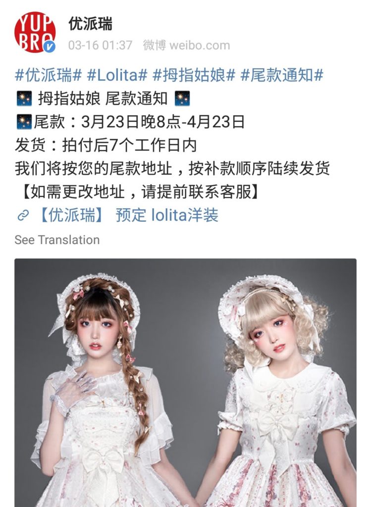 Thumbelina Lolita Dress Matching Bonnet by YUPBRO Lolita