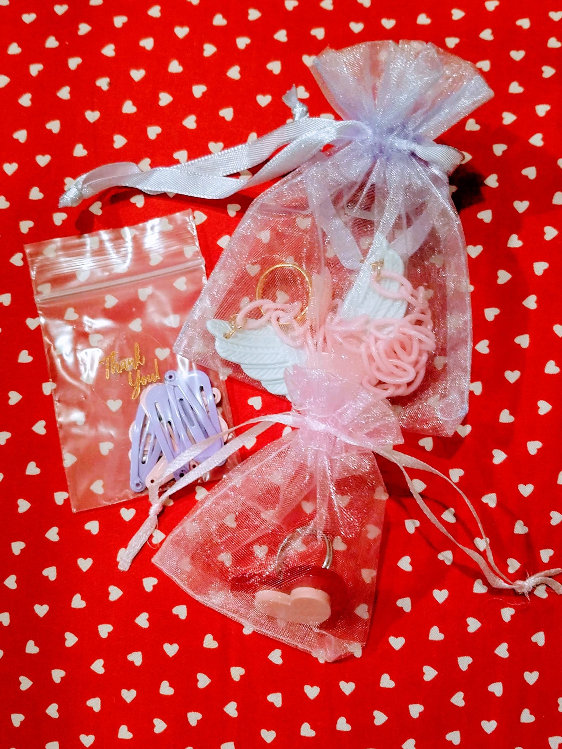 Lastly, inside the small “Thank You” bag, the designer tucked 8 little mini hair clips, 4 pink and 4 lavender.