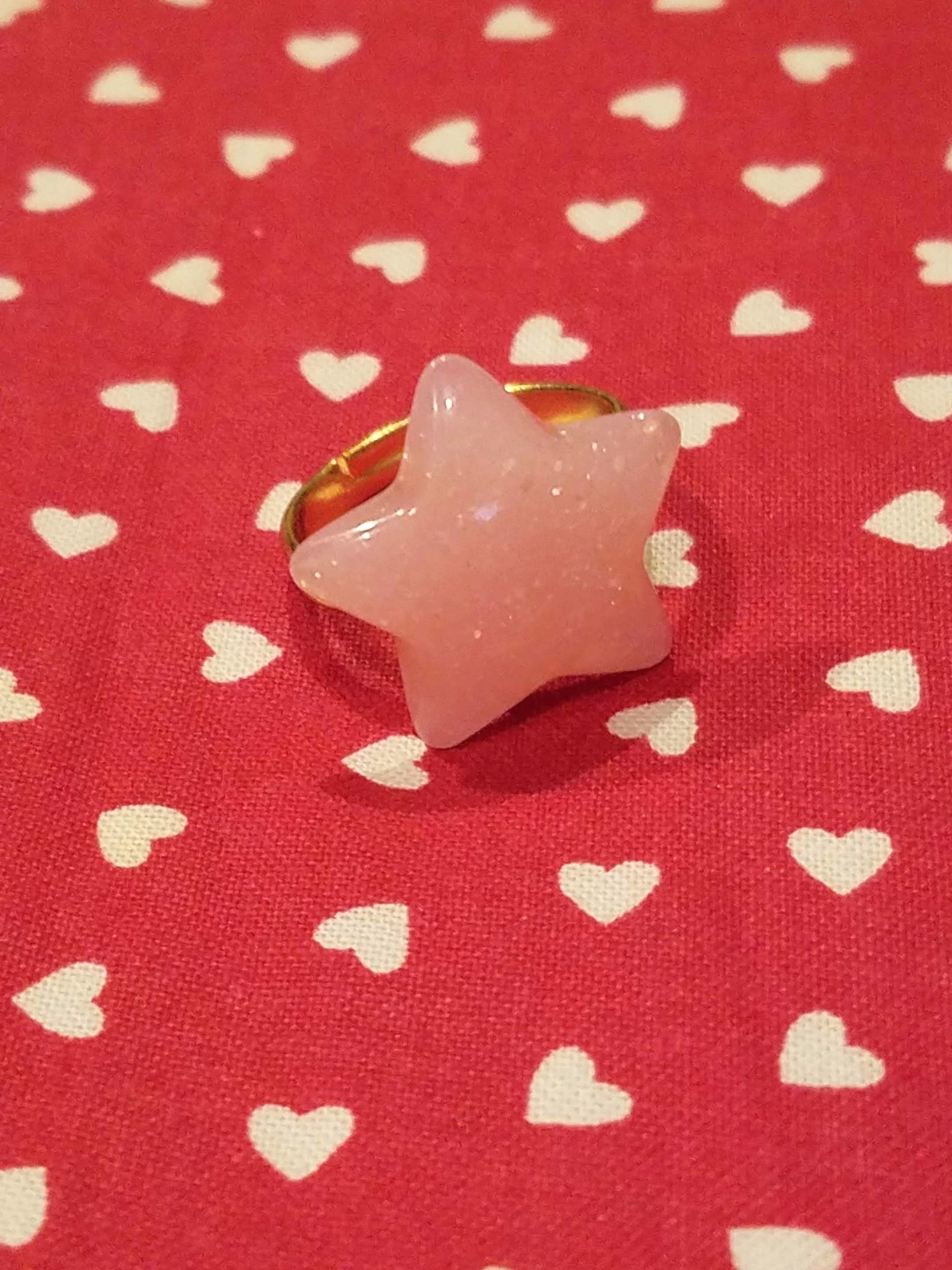 Again, sticking with the gold tone metal, which I like. The star (and the heart in the necklace) has a very fine glitter that is high impact IRL throughout the body of the shape. It’s very shiny an has a nice smooth finish. There is no tackiness or stickiness to these shapes (which I am assuming are resin) and no pits or bubbles with a very uniform thickness and finish. Again, solid, sturdy adjustable ringbase.