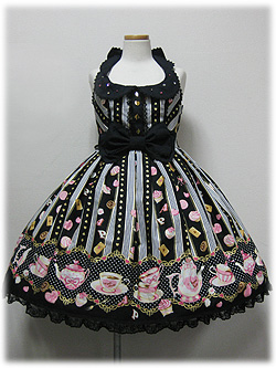 So, what is she talking about if she’s not talking about cute AP prints on black? Well, primarily she’s talking about older “sweet” print motifs like florals, berries and music on a black base. From a more modern stand point, a lot of what she is describing is stuff that might have been filed under “Sweet Classic” a few years later when that sort of transitional category term was popular. Which, also kind of brings up a side point; not every piece is firmly a single substyle. Some pieces can be styled into different substyles depending on how they are coordinated, and also, our definitions of what is or isn’t a particular substyle shift over time.
