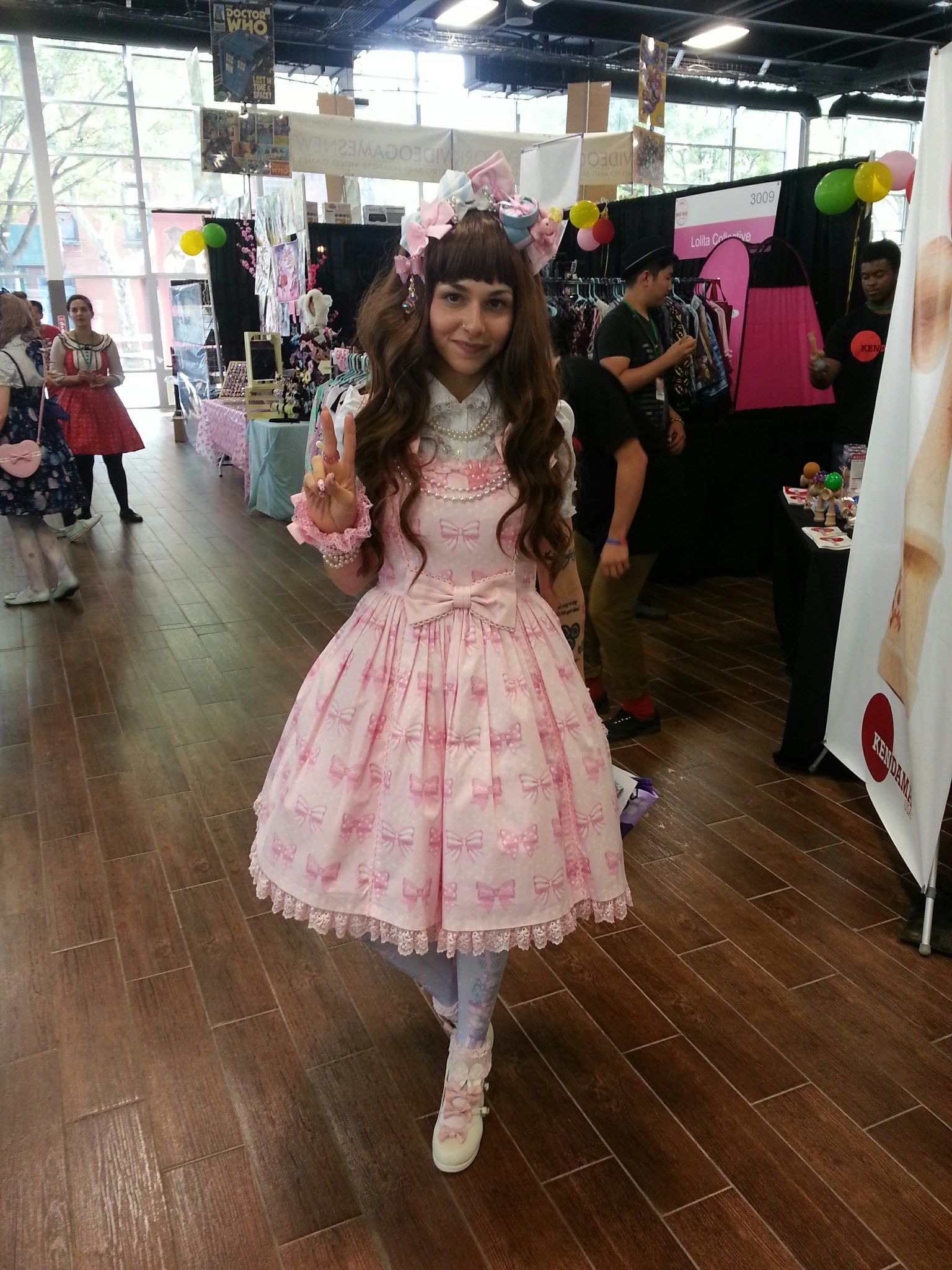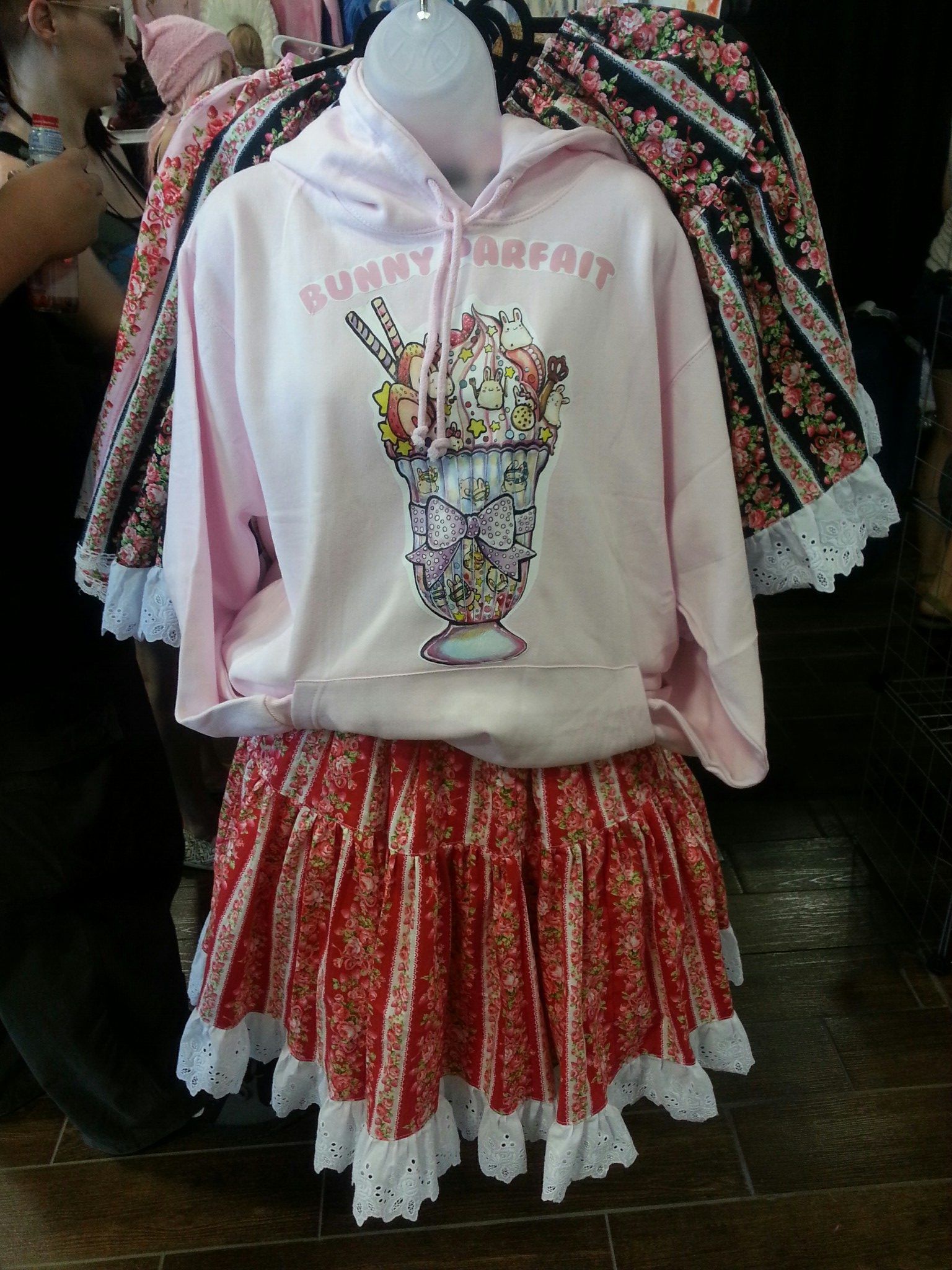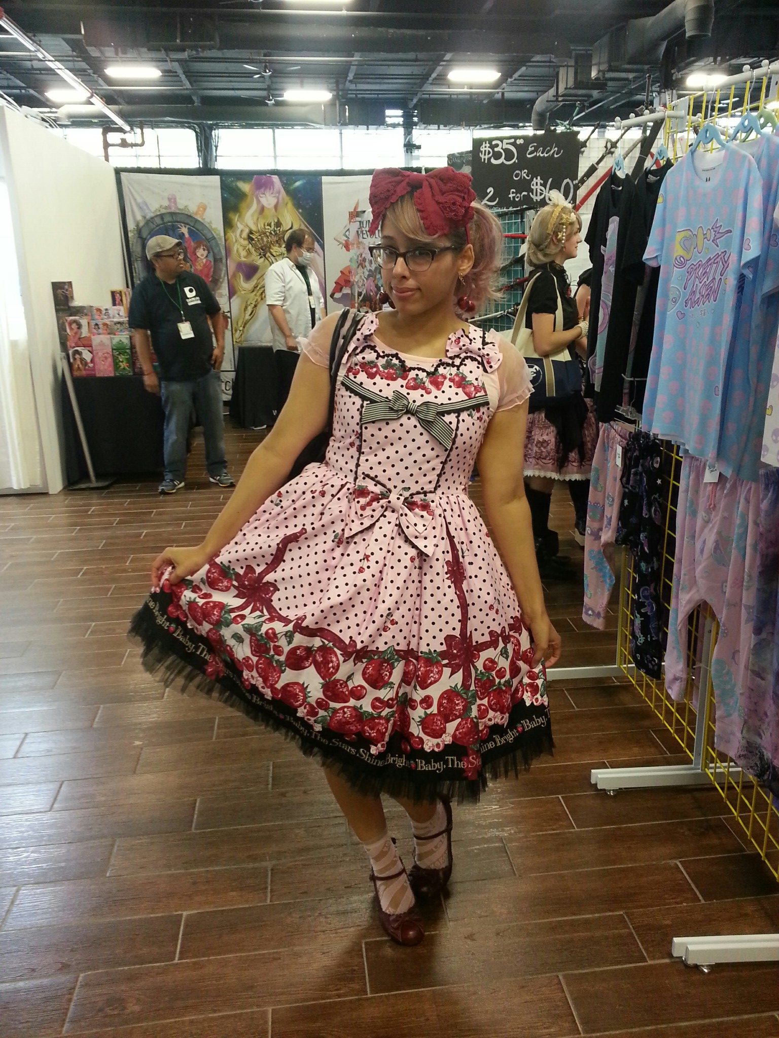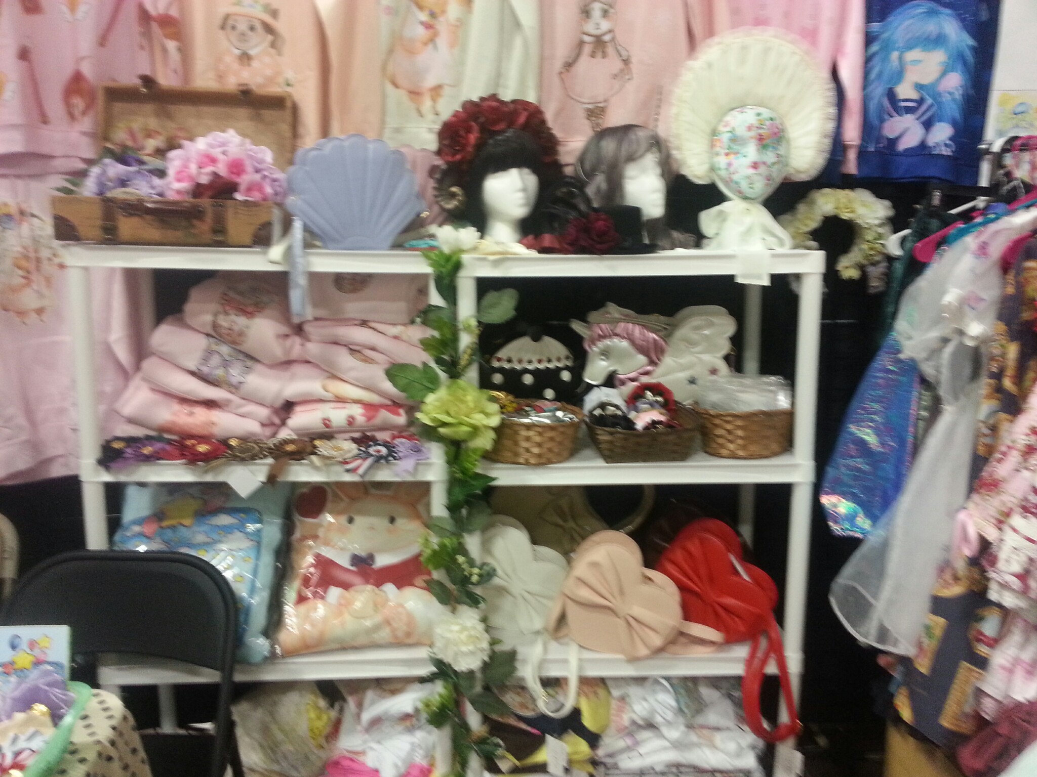 As many of you already know, my girlfriend is one of the designer’s for Bellaonna, so we traveled up to the convention together, and I helped out in the Petticoat Parlor booth, which was selling some of her things. Petticoat Parlor featured items from local indie lolita brands Belladonna and Sweet Mildred, and artwork/stationary/shirts/pillows and accessories from the illustrator Mint and Apple. We also were selling some consignment items, wigs from Brightlele and items from Swimmer.