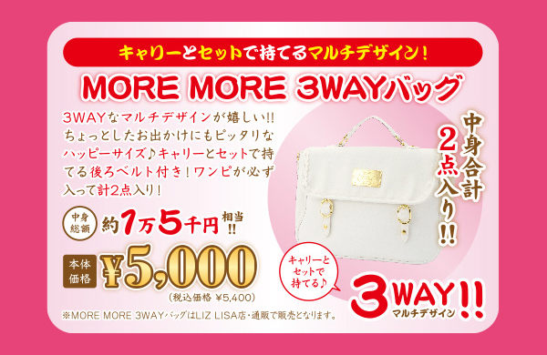 ※ MOREMORE 3WAY bag will be sold in the LIZ LISA stores and online.